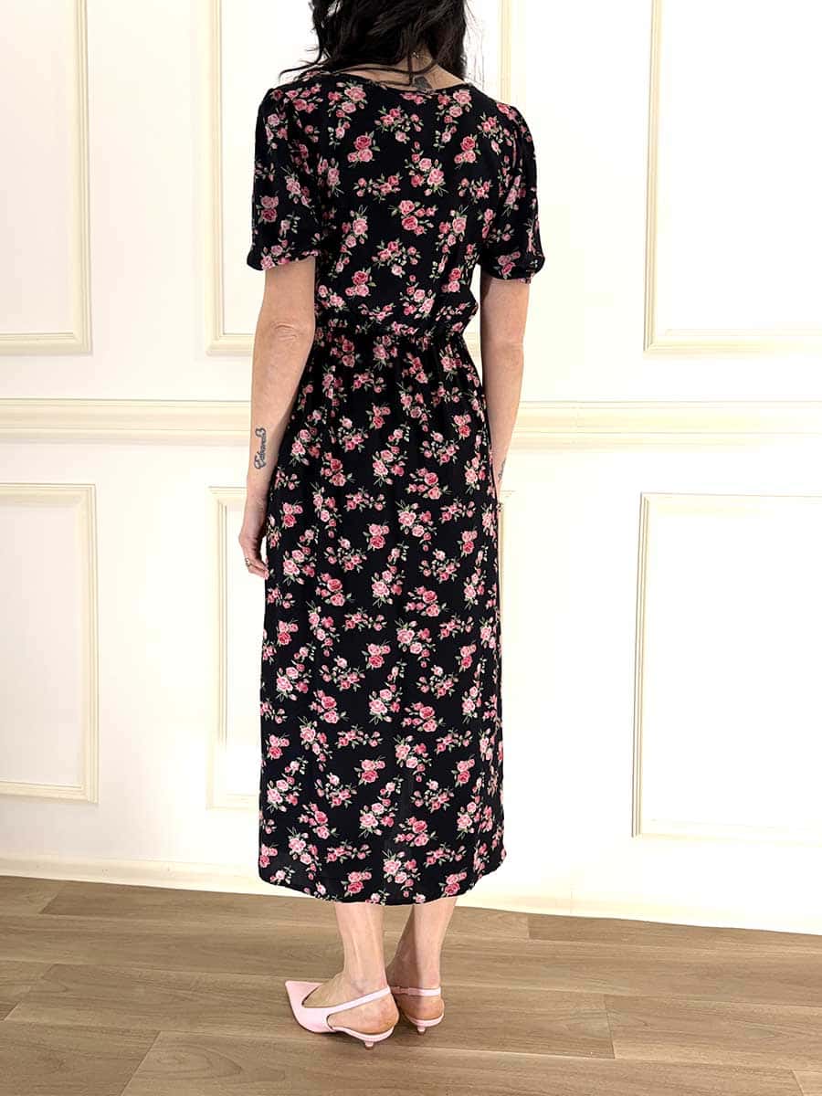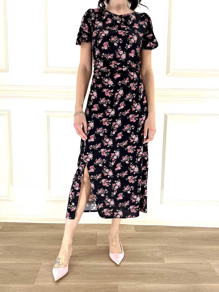 Abito girocollo , mezza manica, stampa floreale , spacco sul davanti e arricciatura sul fianco che esalata a e slancia la silhouette.
