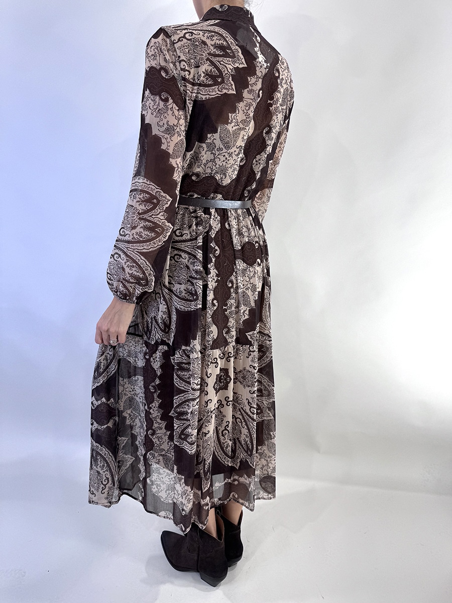 Abito in stampa fantasia , tessuto leggero nei toni del moro e del beige, caratterizzato da colletto a camicia , bottoniera forntale, maniche lunghe ampie e cintura in vita che valorizza la silhouette.