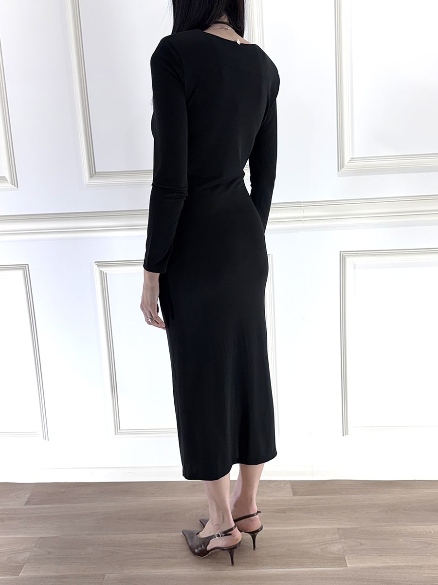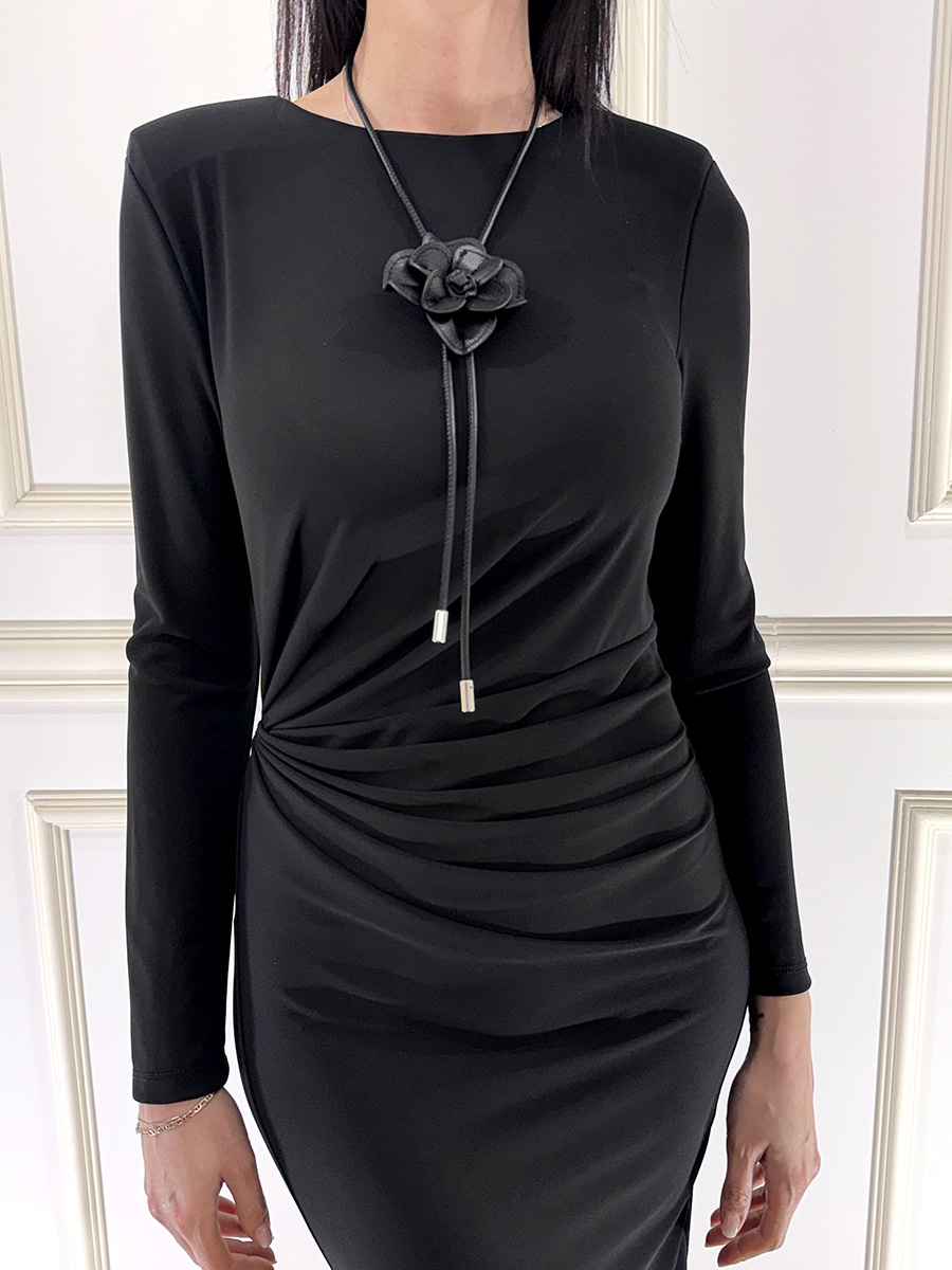 abito girocollo manica lunga , arricciatura sul punto vita e collana in dotazione , il tessuto elasticizzato esalta la silhouette con naturalezza, spacco sul retro.