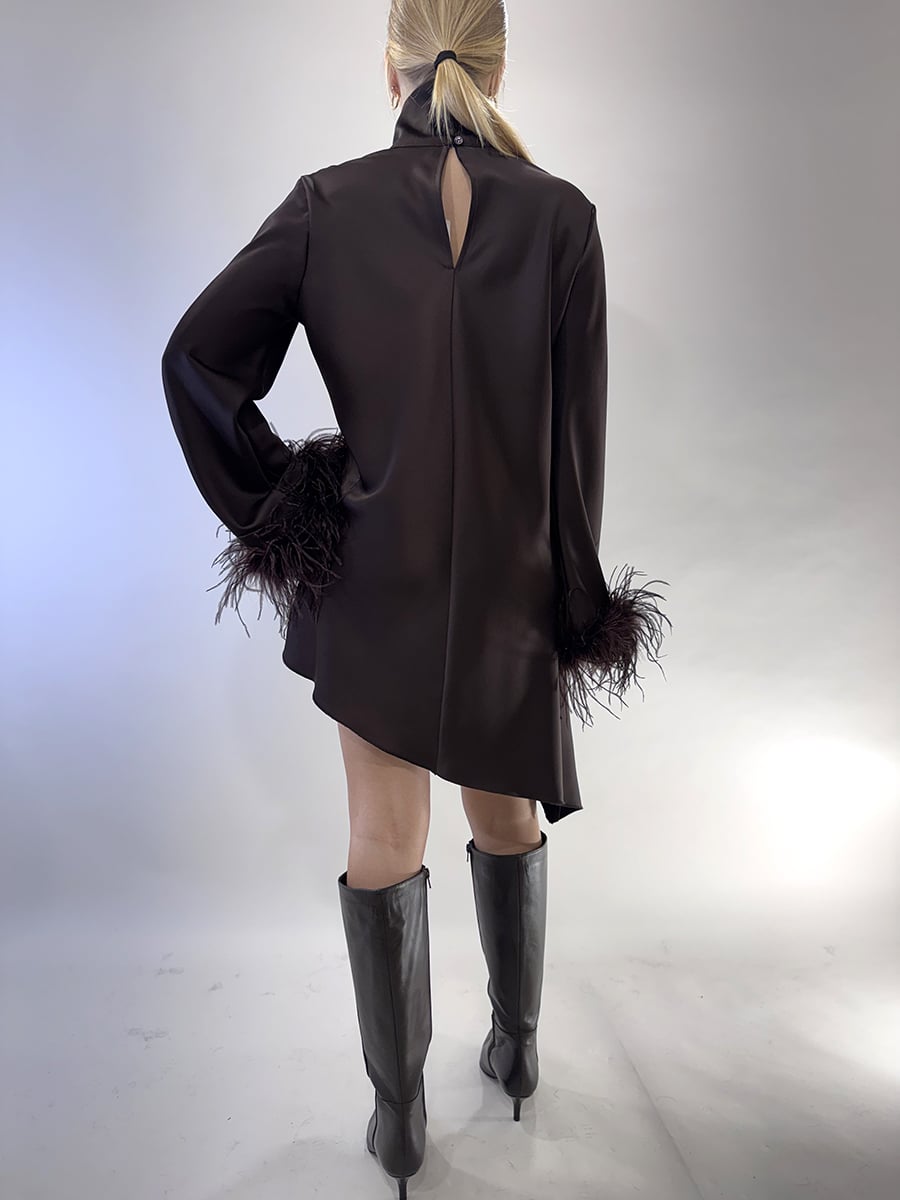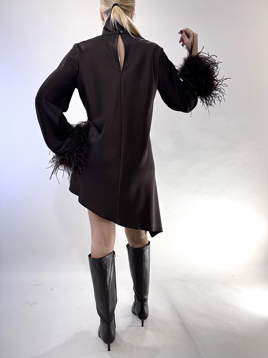 abito con colletto , asimmetrico , tessuto lucido e piume nelle maniche.