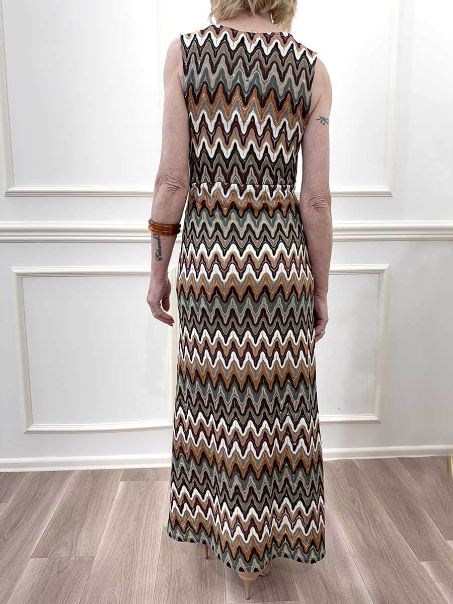 Abito in stampa zig zag , scollo a v , elasticizzato , esalta e delinea la silhouette con naturalezza, giromanica.