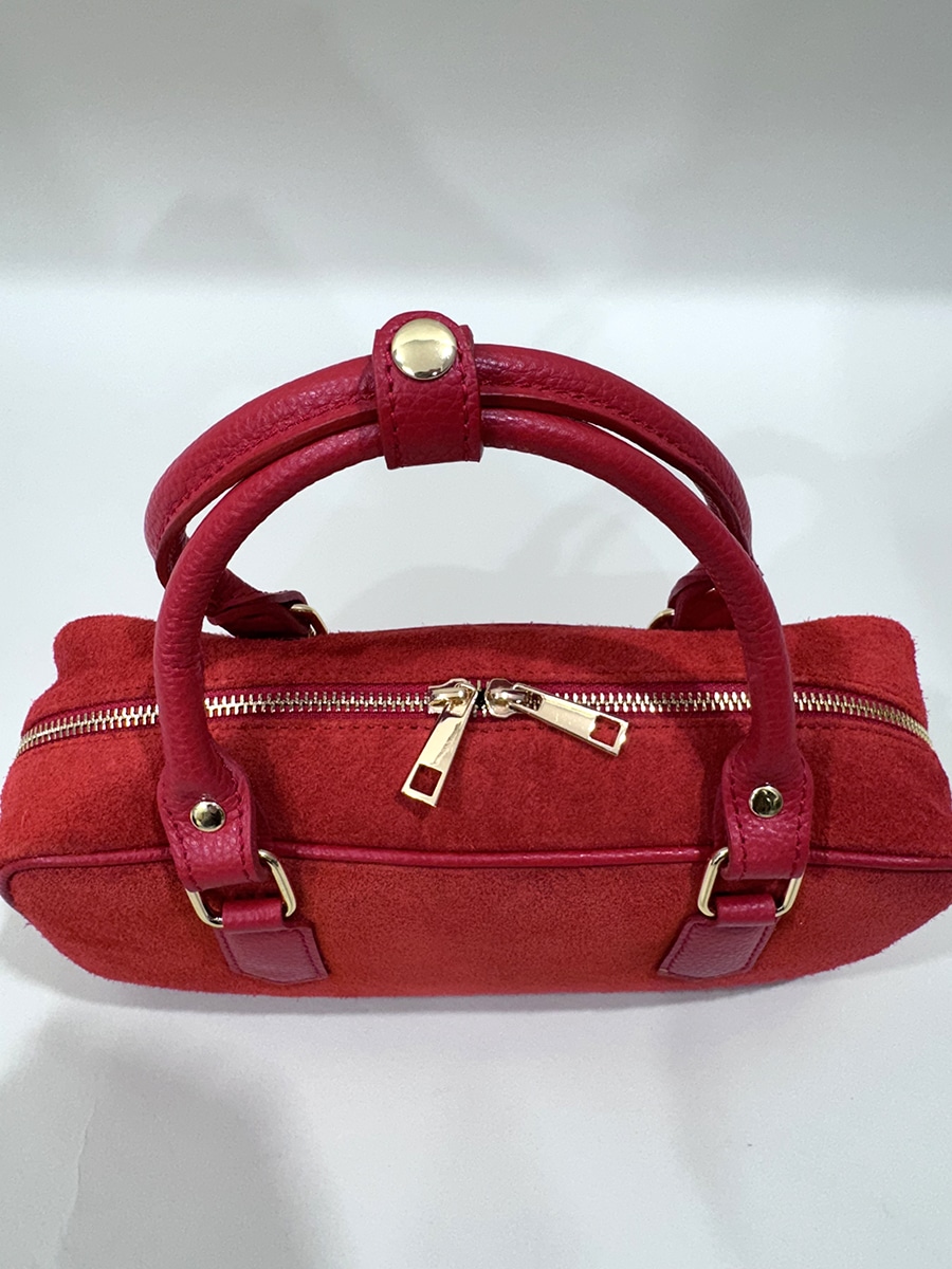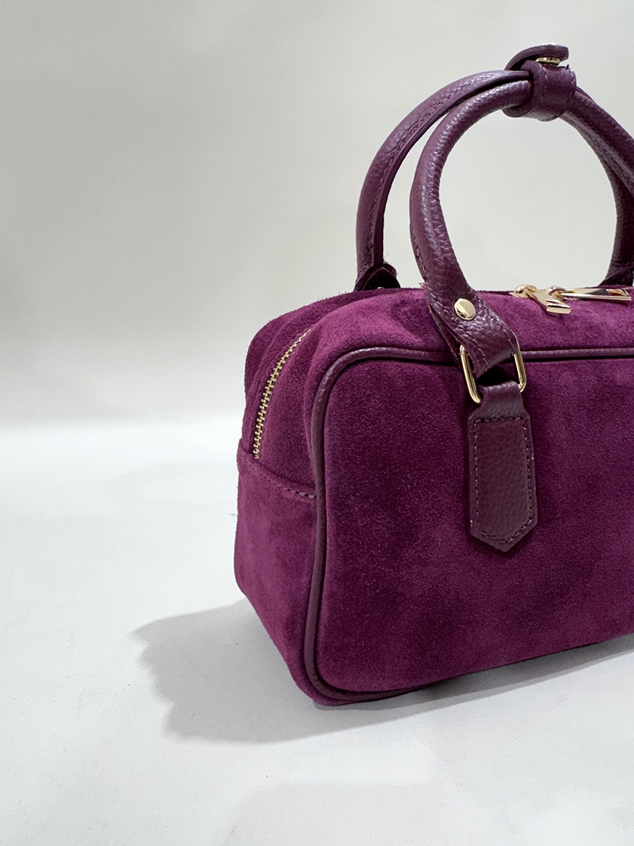 Bauletto di forma rettangolare, pelle scamosciata , manici e dettagli in pelle liscia . Due manici corti per il trasporto a mano . dotata di tracolla interna in pelle liscia. accessori metallici ,come gli anelli e la zip che aggiunge un tocco elegante al design.