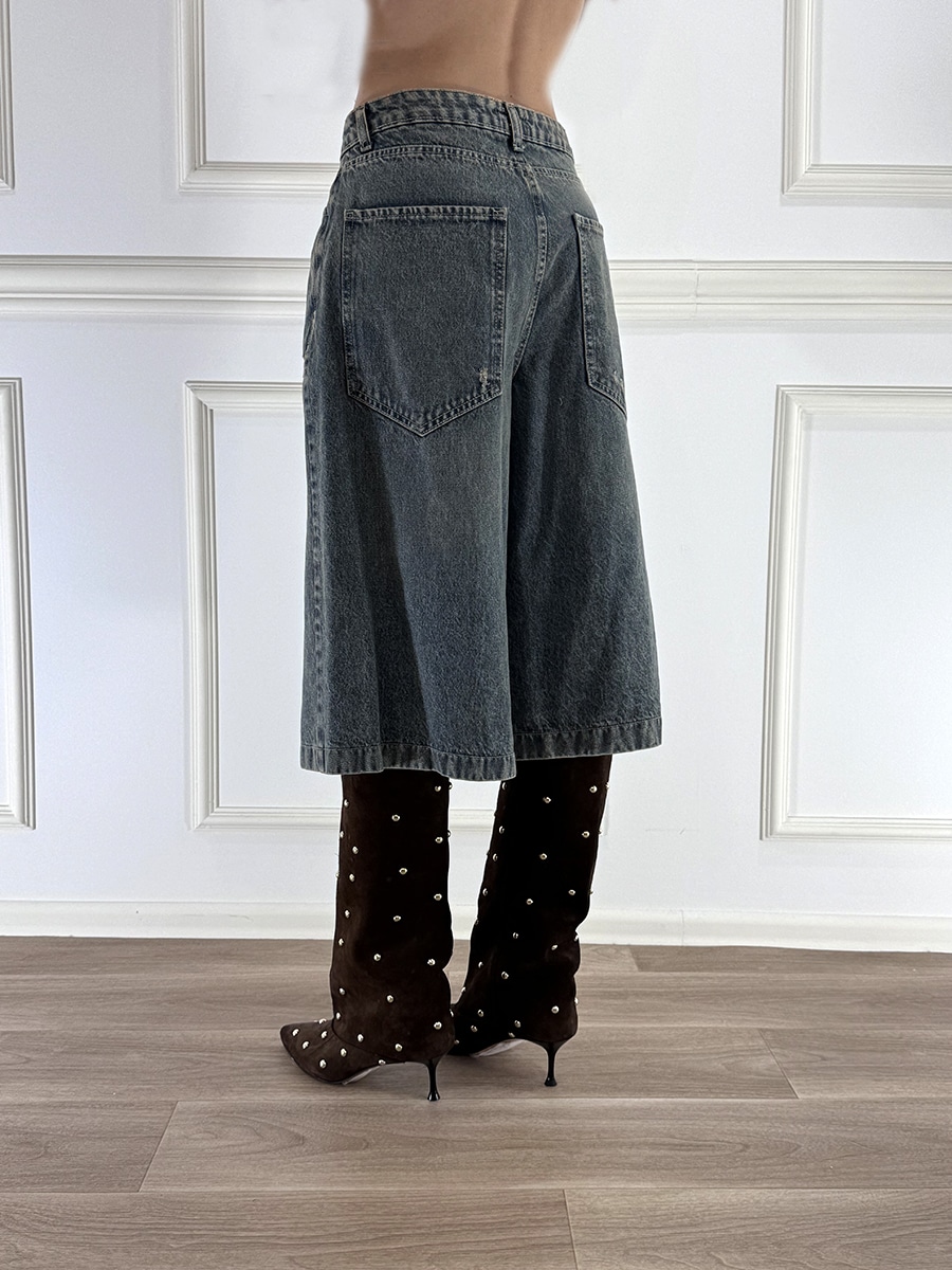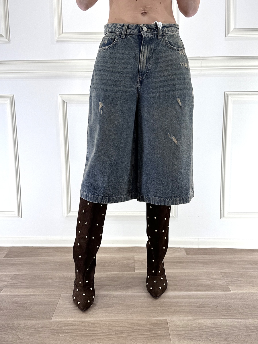 Bermuda jeans, zip e bottone davanti per la chiusura, lavaggio denim con abrasioni, modello 5 tasche.