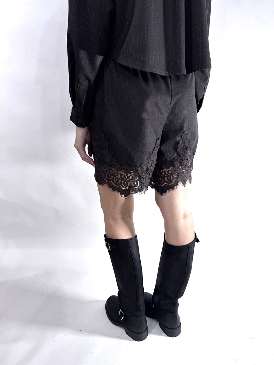 Bermuda gessato a righe verticali su base moro , elastico e coulisse in vita , pizzo sul fondo che dona un tocco elegante e sofisticato al capo.