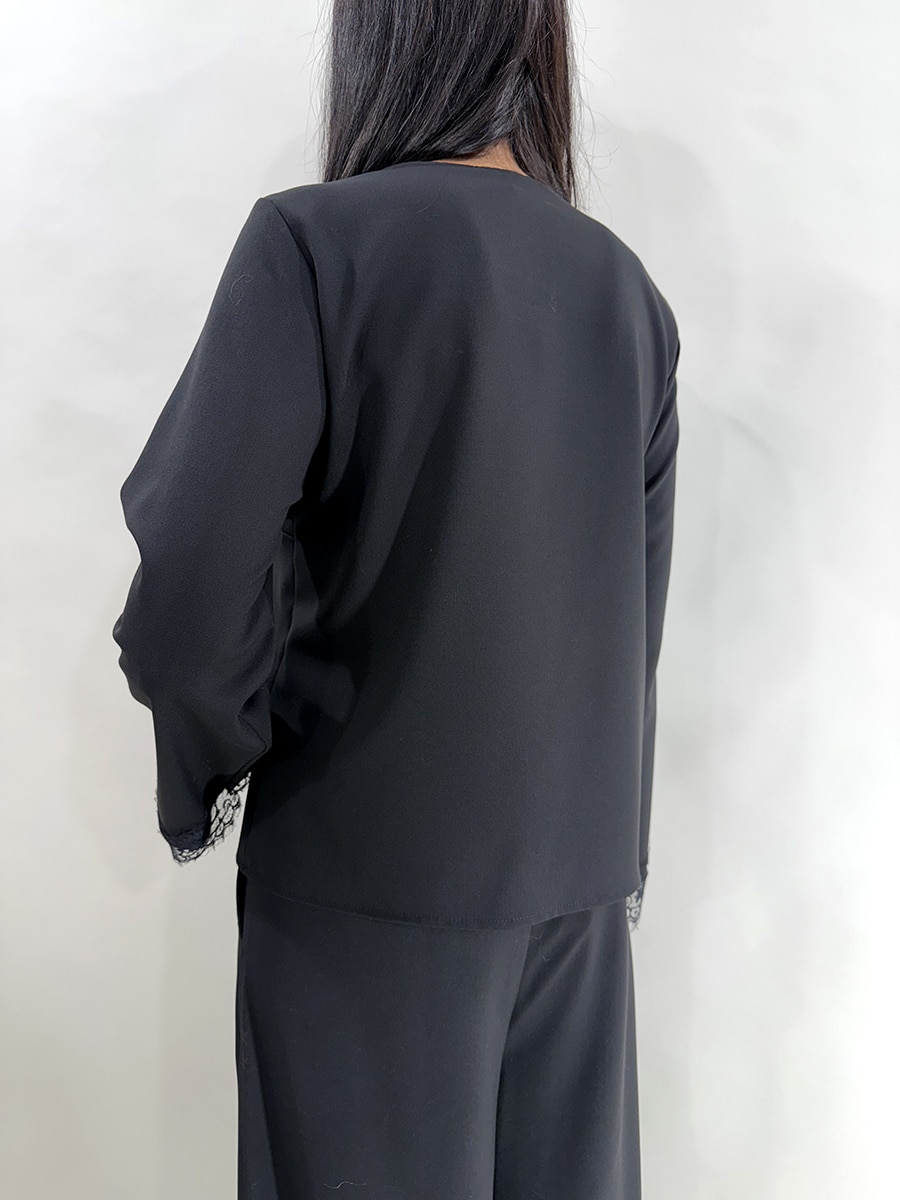 Collo a V, con inserto nero decorato, che aggiunge un tocco femminile e sensuale. Maniche rifinite con un pizzo decorato che richiama il dettaglio dello scollo.