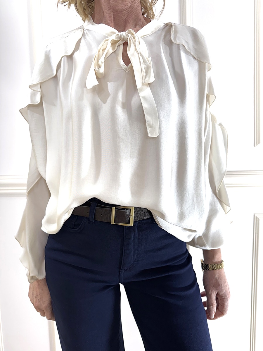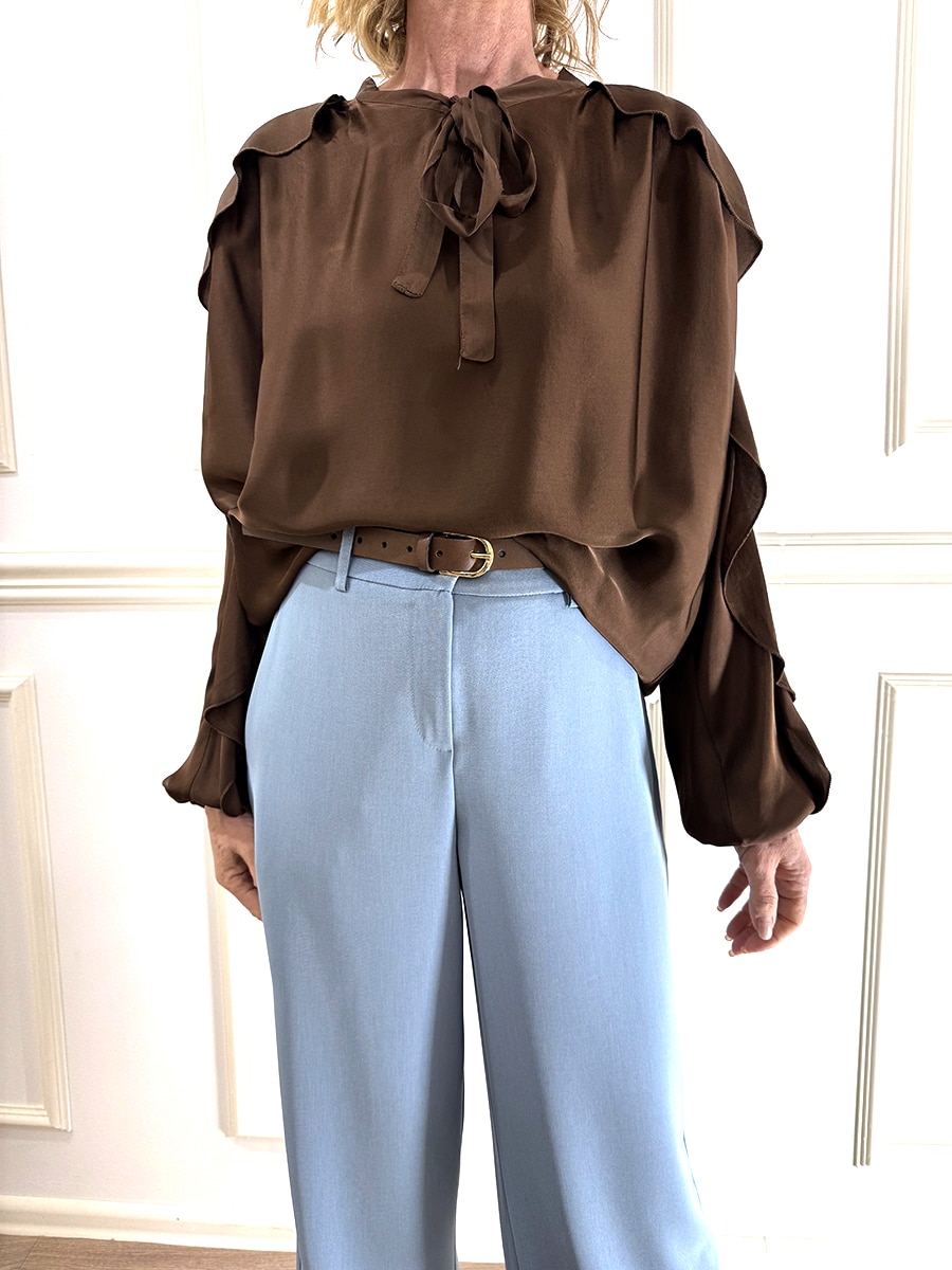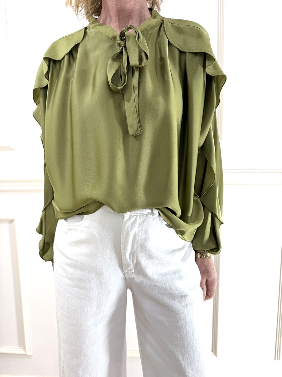 Blusa con volant laterali , polsini con elastico per regolare l’altezza e laccetti sul davanti per un eventuale fiocco.