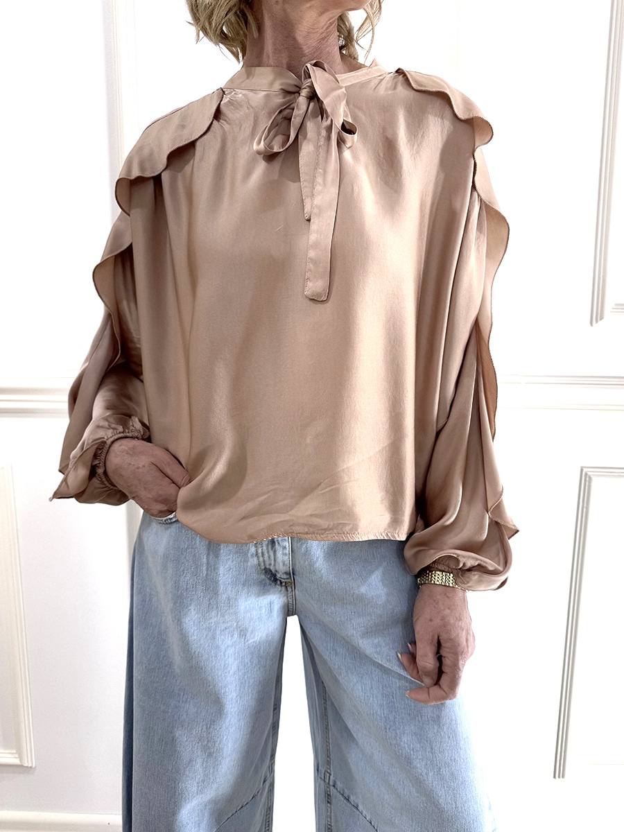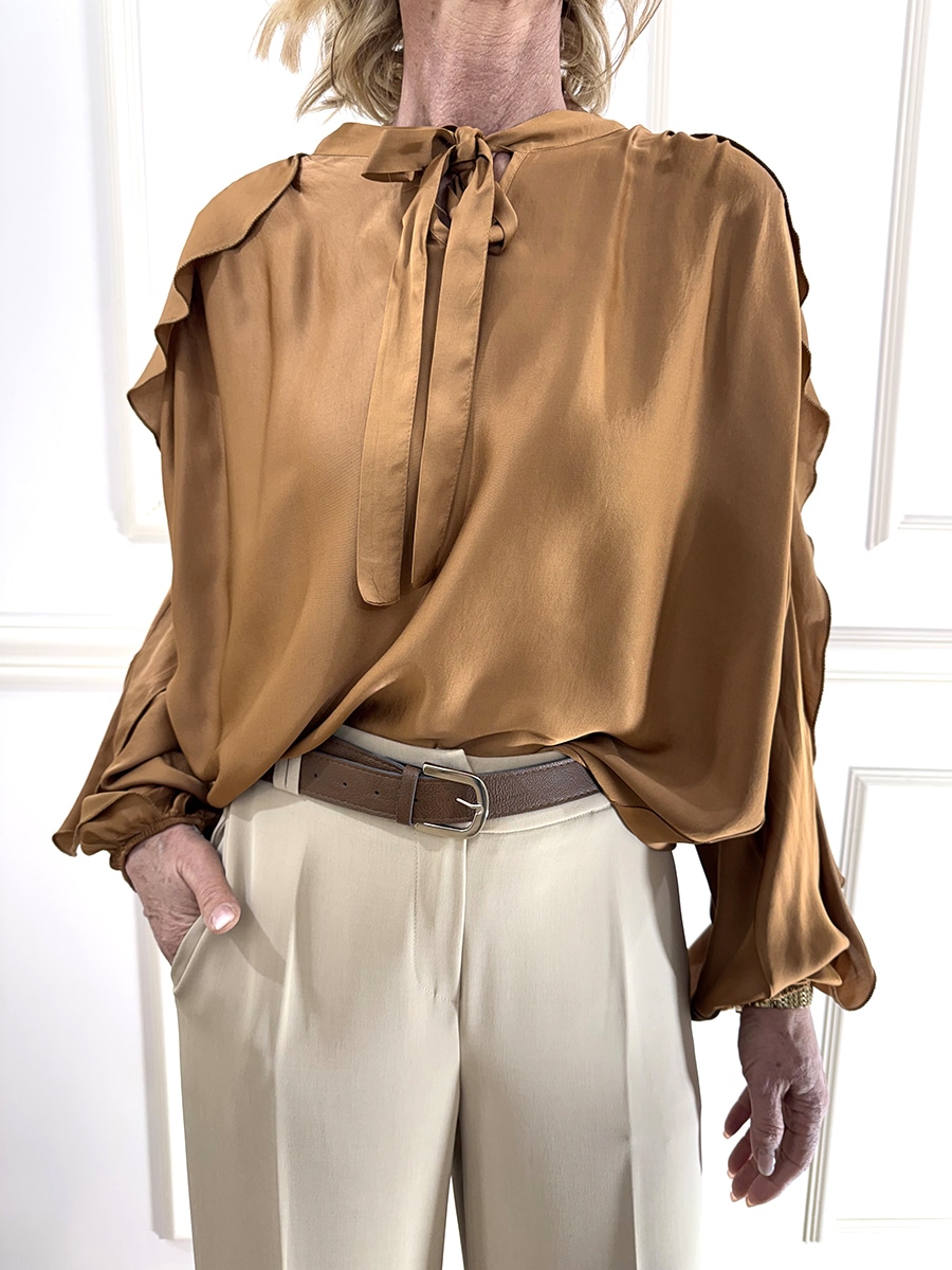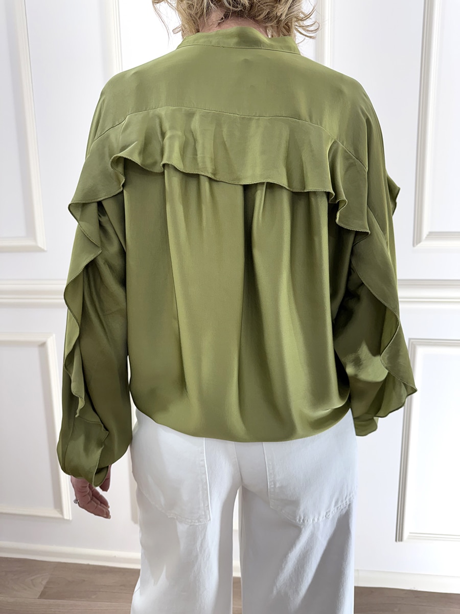 Blusa con volant laterali , polsini con elastico per regolare l’altezza e laccetti sul davanti per un eventuale fiocco.