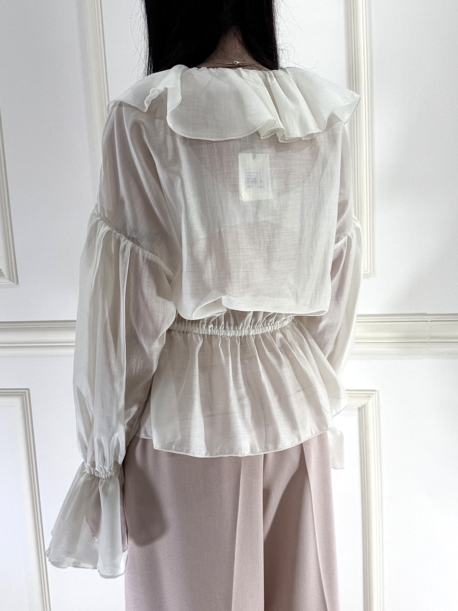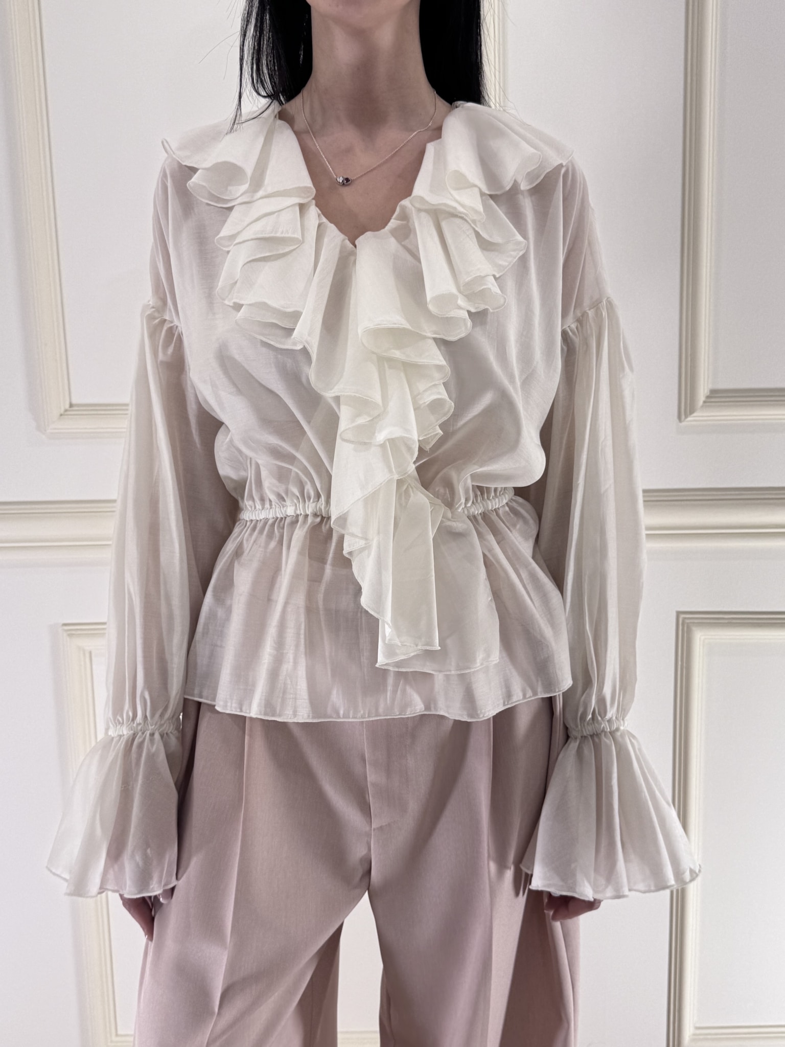 Blusa scollo v con rouges , arricciatura in vita con elastico che valorizza la silhouette , arricchita da volant in cascata sul davanti.