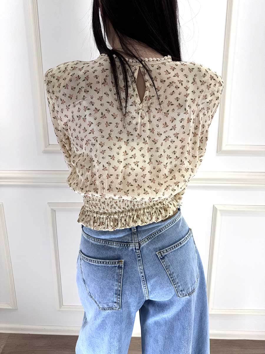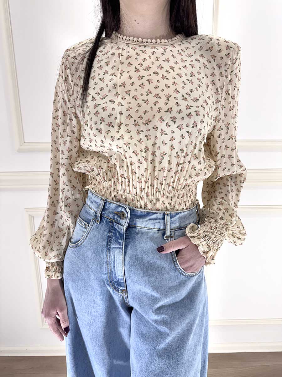 Blusa floreale in tessuto leggero, girocollo e chiusura sul retro con bottoncino. Il fondo e i polsini arricciati per una vestibilità comoda.