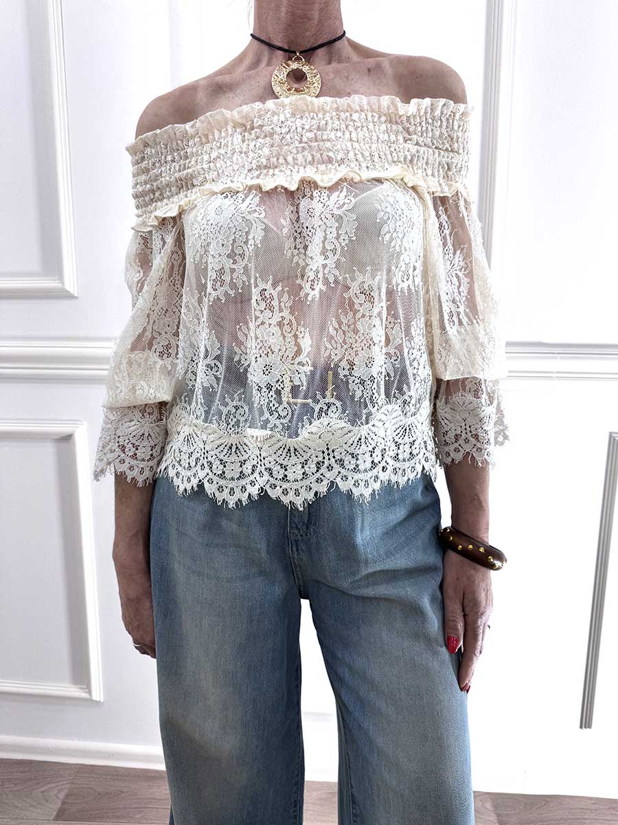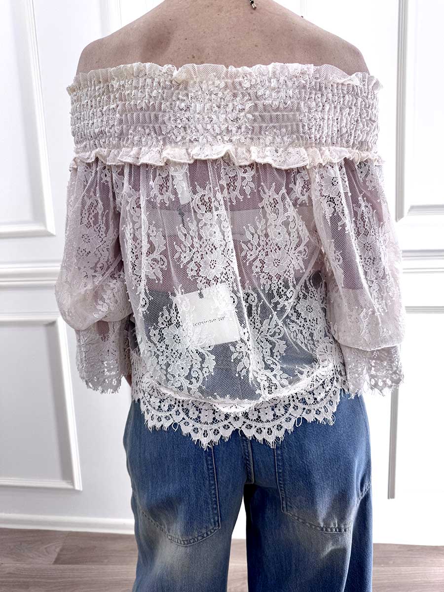 Blusa in pizzo scollo shiffer elasticato che valorizza con discrezione l’omerale e le spalle.