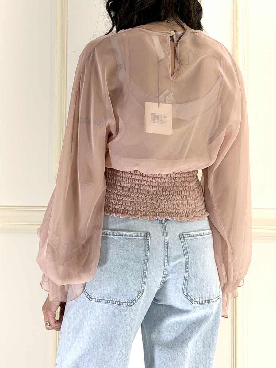 Blusa velata semi trasparente con elastico in fondo e canotta inserita per comfort e coprenza. Maniche a palloncino donano raffinatezza ed eleganza al capo.Chiusura sul retro con bottoncino.
