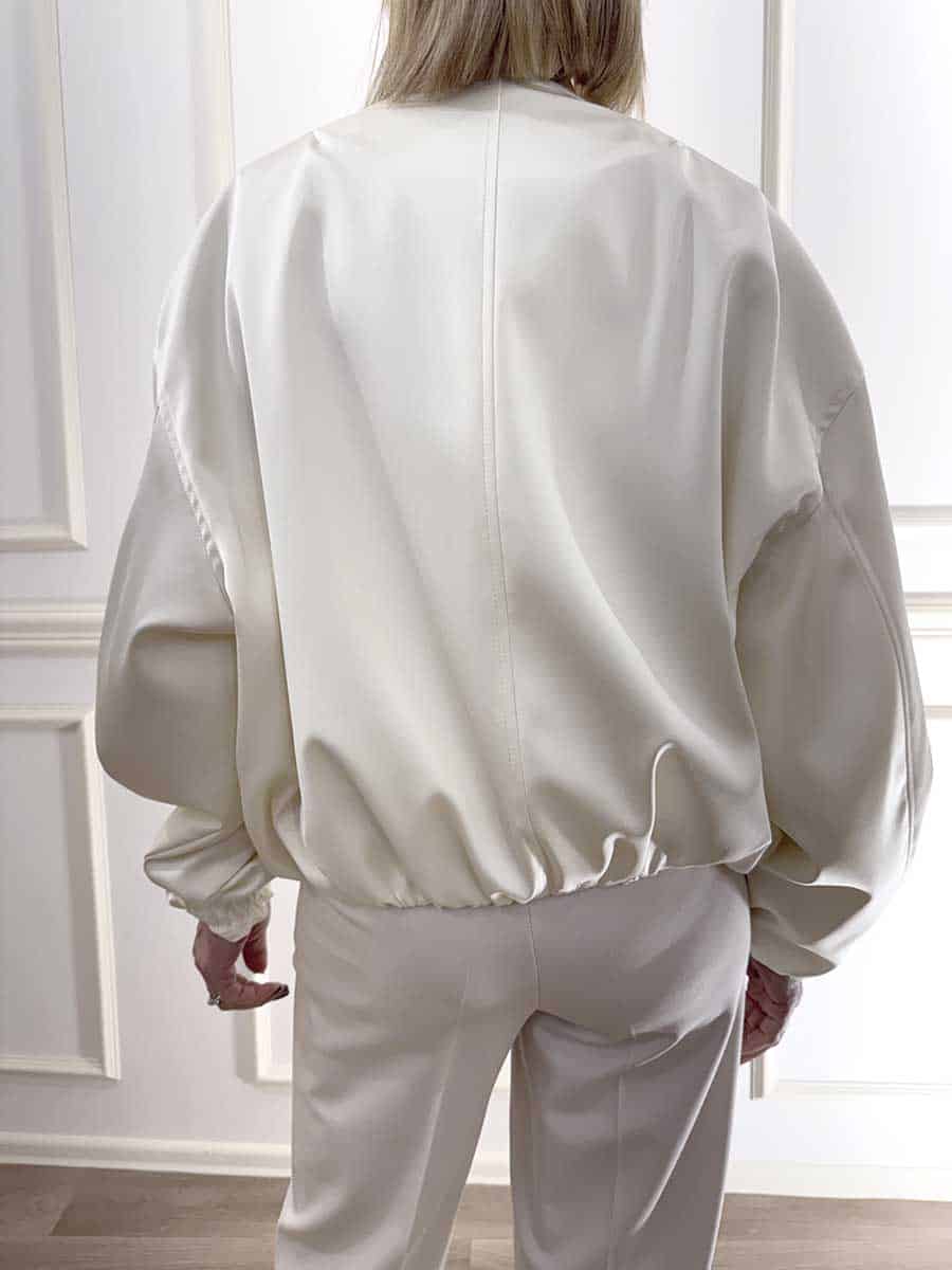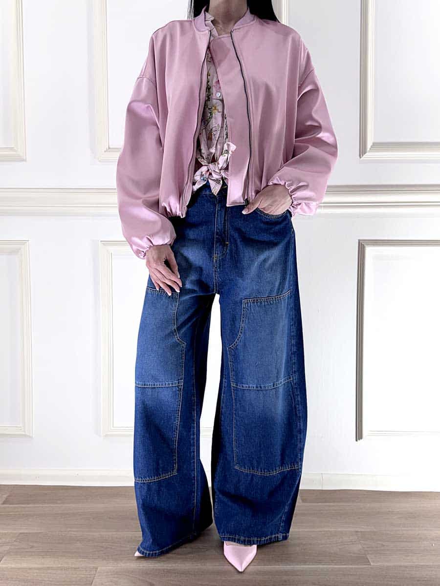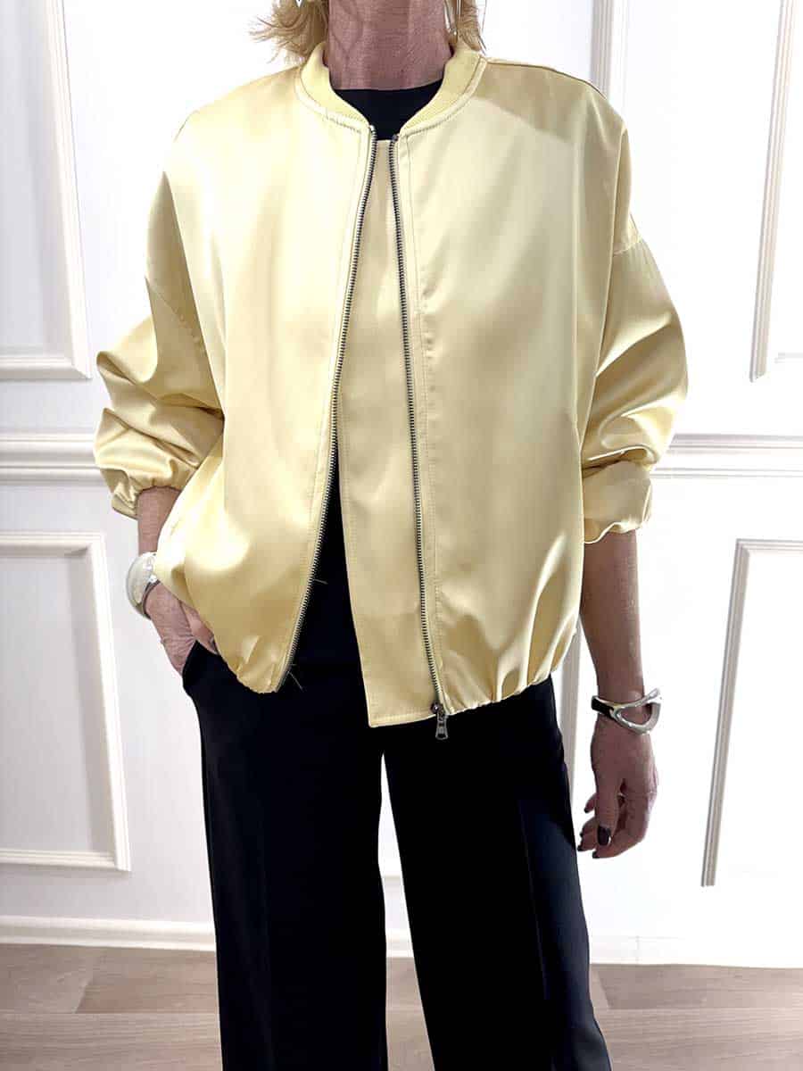 Bomber modello over , tessuto lucido, colletto sottile, zip davanti per la chiusura , design pulito , elastico in fondo e nei polsini per il massimo comfort .