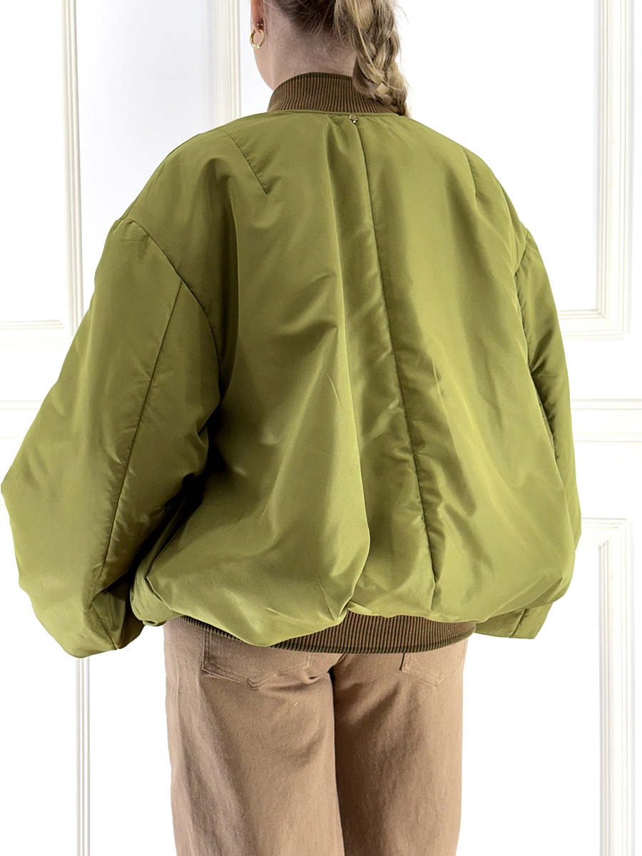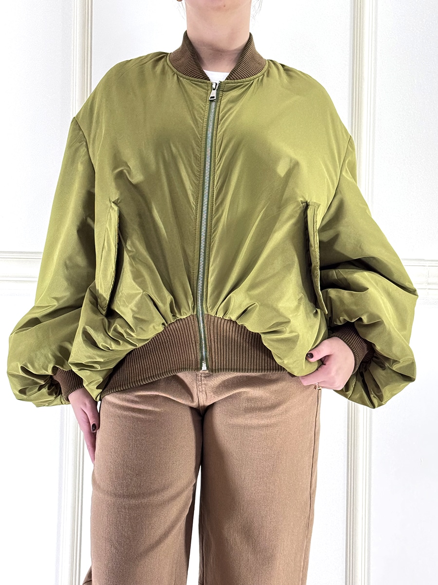 Bomber color verde olio con profilo in maglia , zip davanti per la chiusura e tasche laterali , arricciatura sul fondo per il massimo comfort.