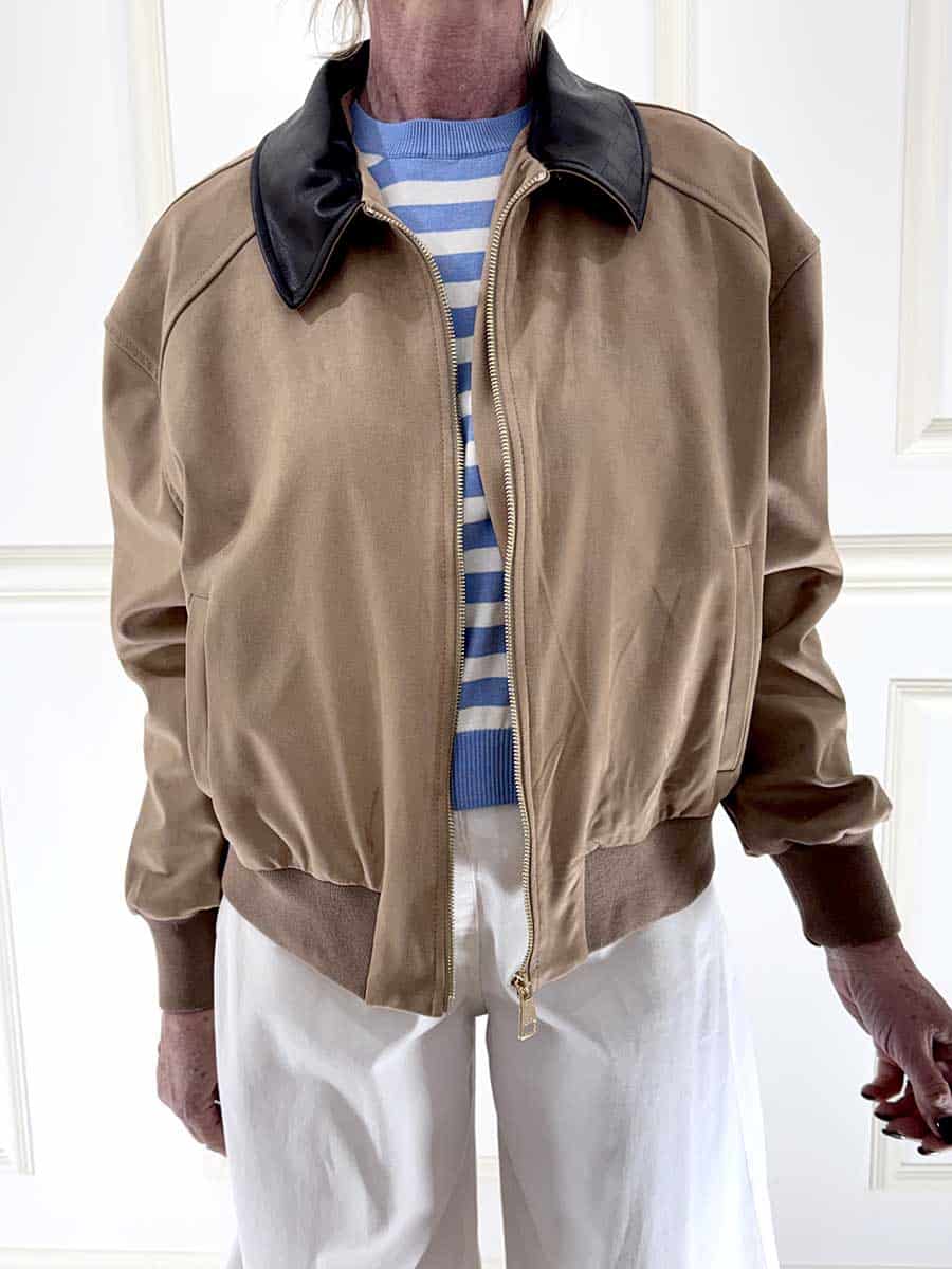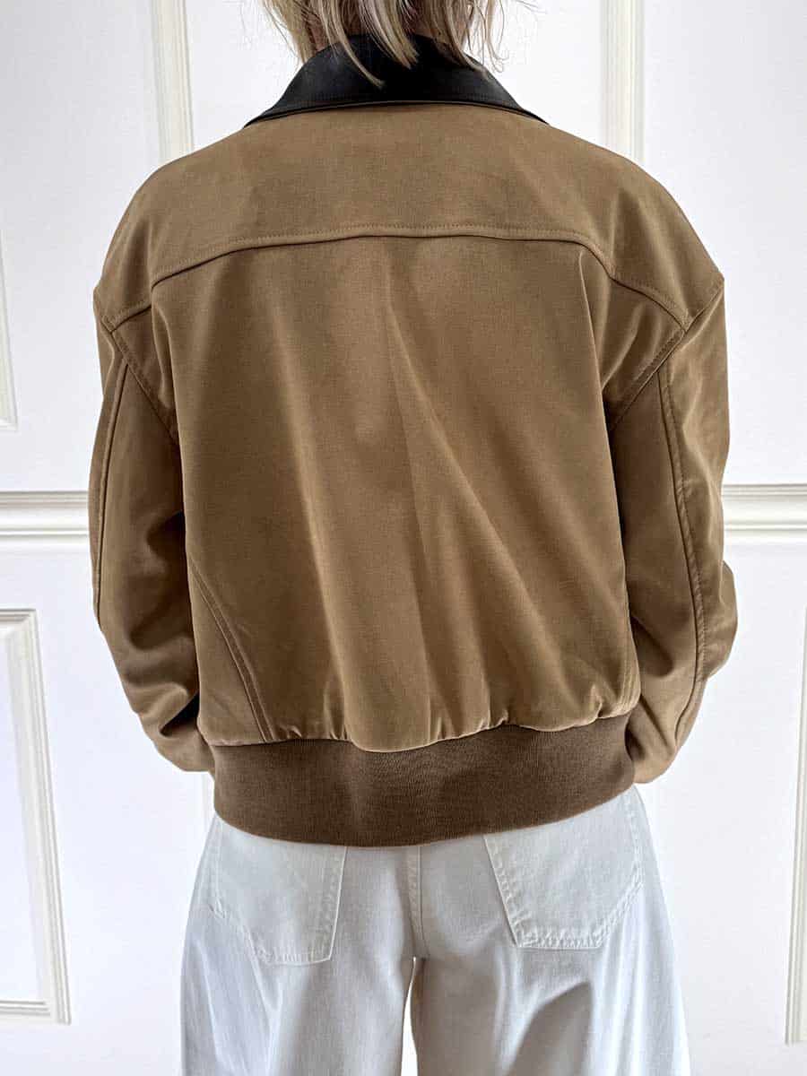 Colore camel e colletto in ecopelle moro per un contrasto netto e deciso. Capo versatile perfetto per look casual o sportivi.
