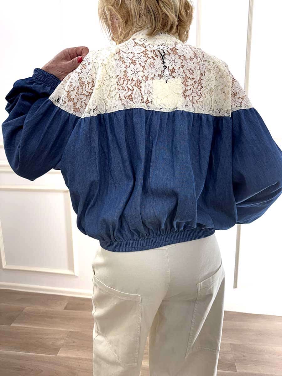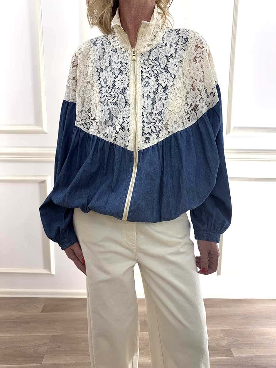 Bomber con zip davanti , polsini e fondo con elastico per il massimo comfort. parte alta in pizzo che conferisce un tocco di raffinatezza e classe al capo unito alla tela chambray che dona freschezza e leggerezza.