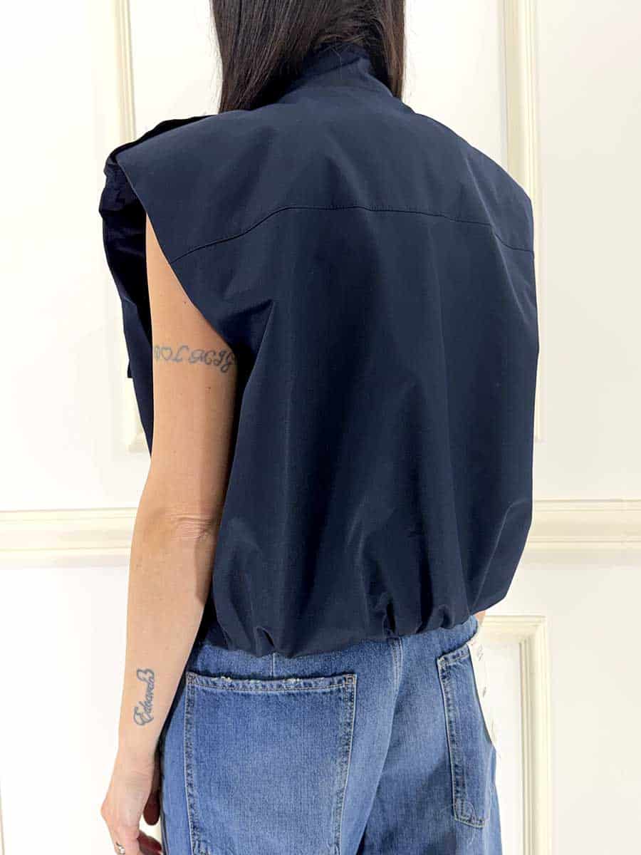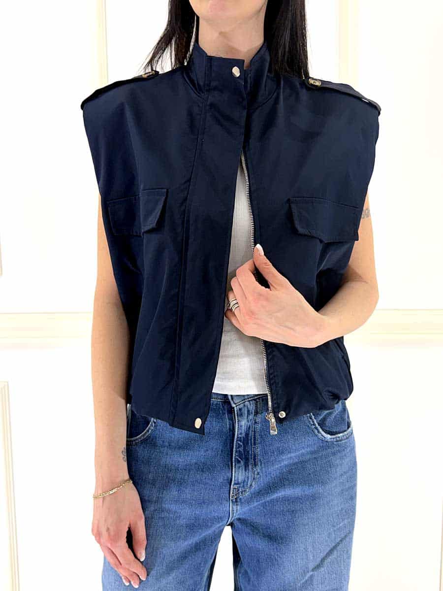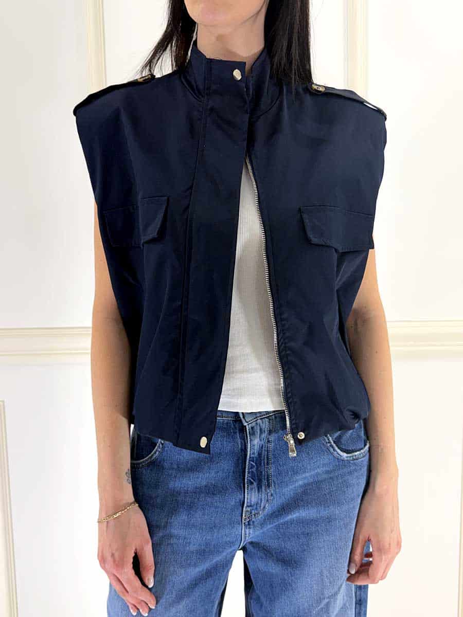 Bomber di colore blu , zip davanti per la chiusura , tasche a patta e laterali per un design pulito e semplice con un tocco di modernità, arricciato sul fondo per una vestibilità confortevole. Fodera interna in contrasto e spalline che donano struttura.