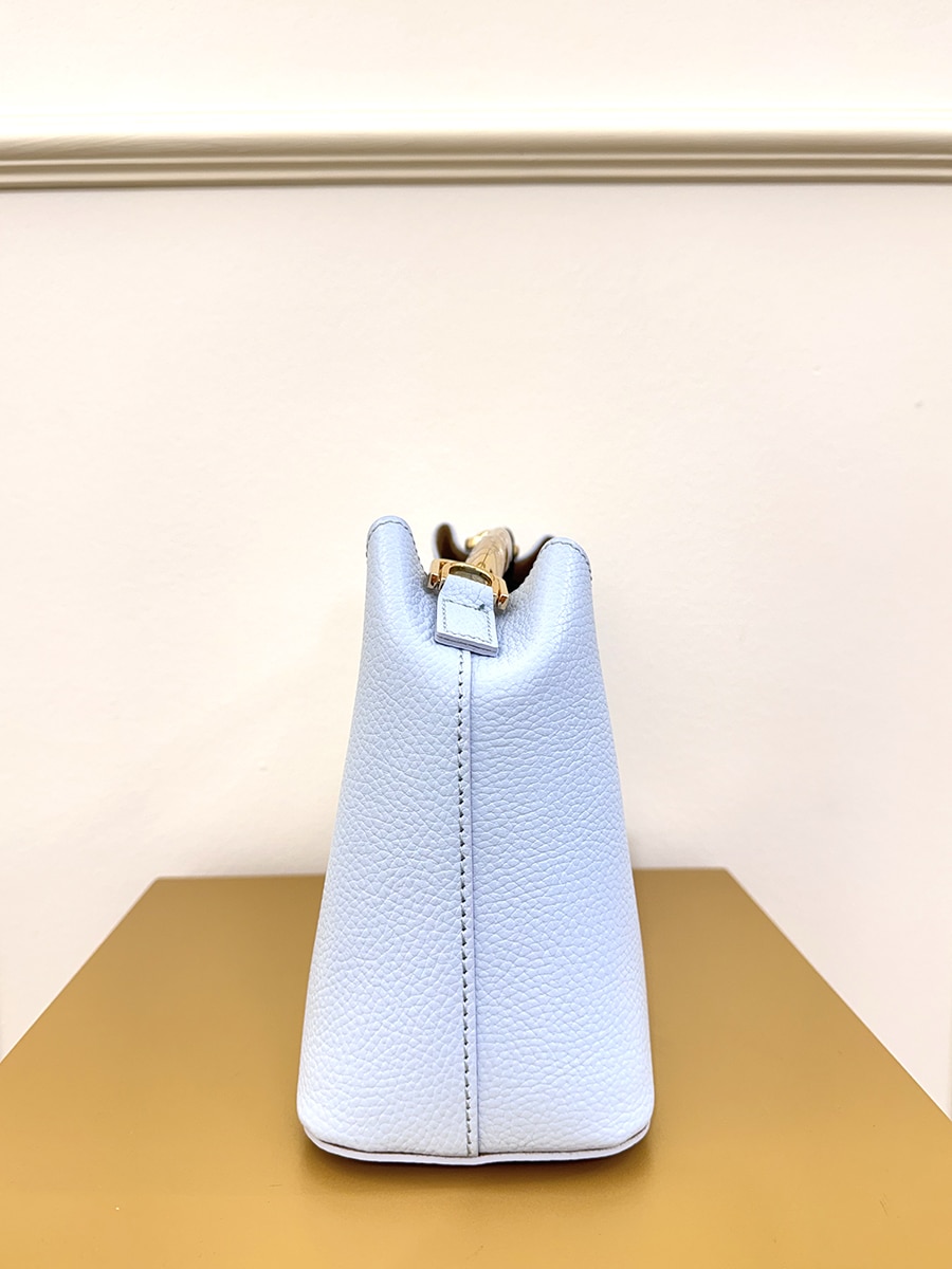 Borsa a mano in pelle con manico rigido con finitura dorata, con tracolla in dotazione. Design compatto ed elegante. Disponibile nelle varianti colore rosso e azzurro.