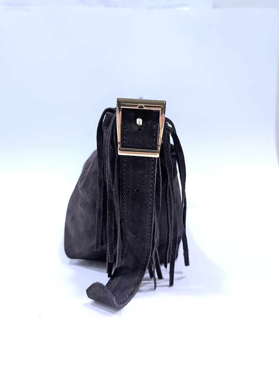Borsa in pelle scamosciata dal design morbido e minimalista con dettagli boho che la rendono distintiva.