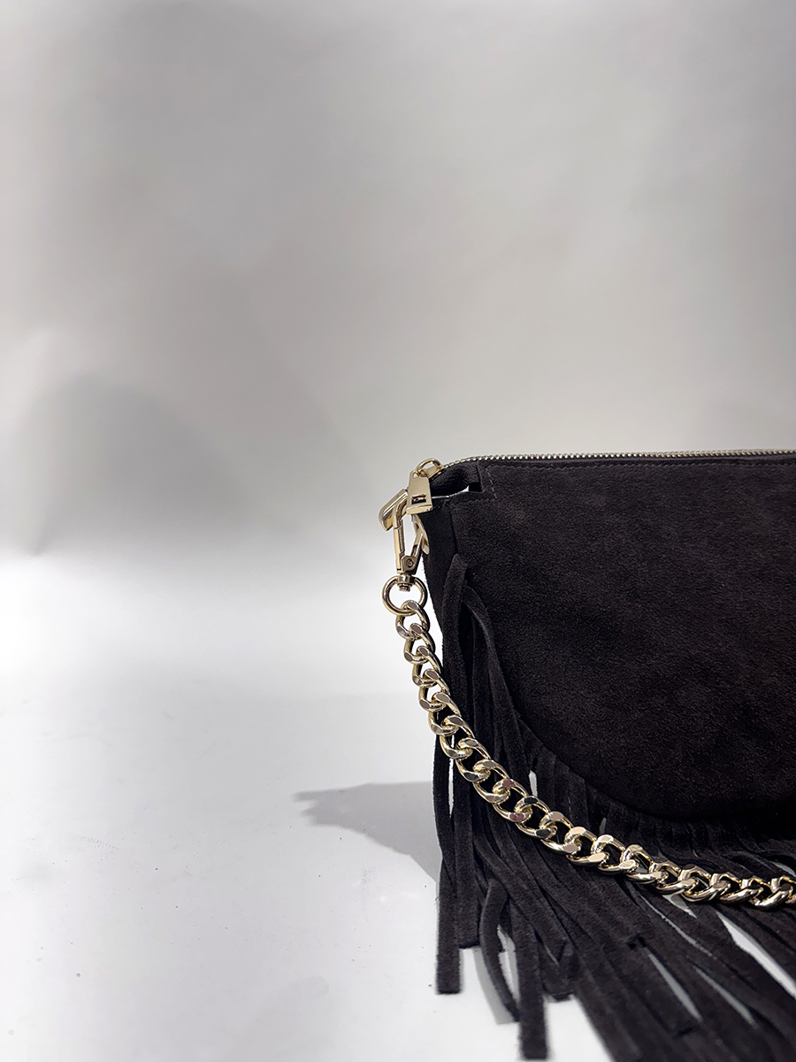 Borsa in pelle scamosciata con frange , zip per la chiusura.