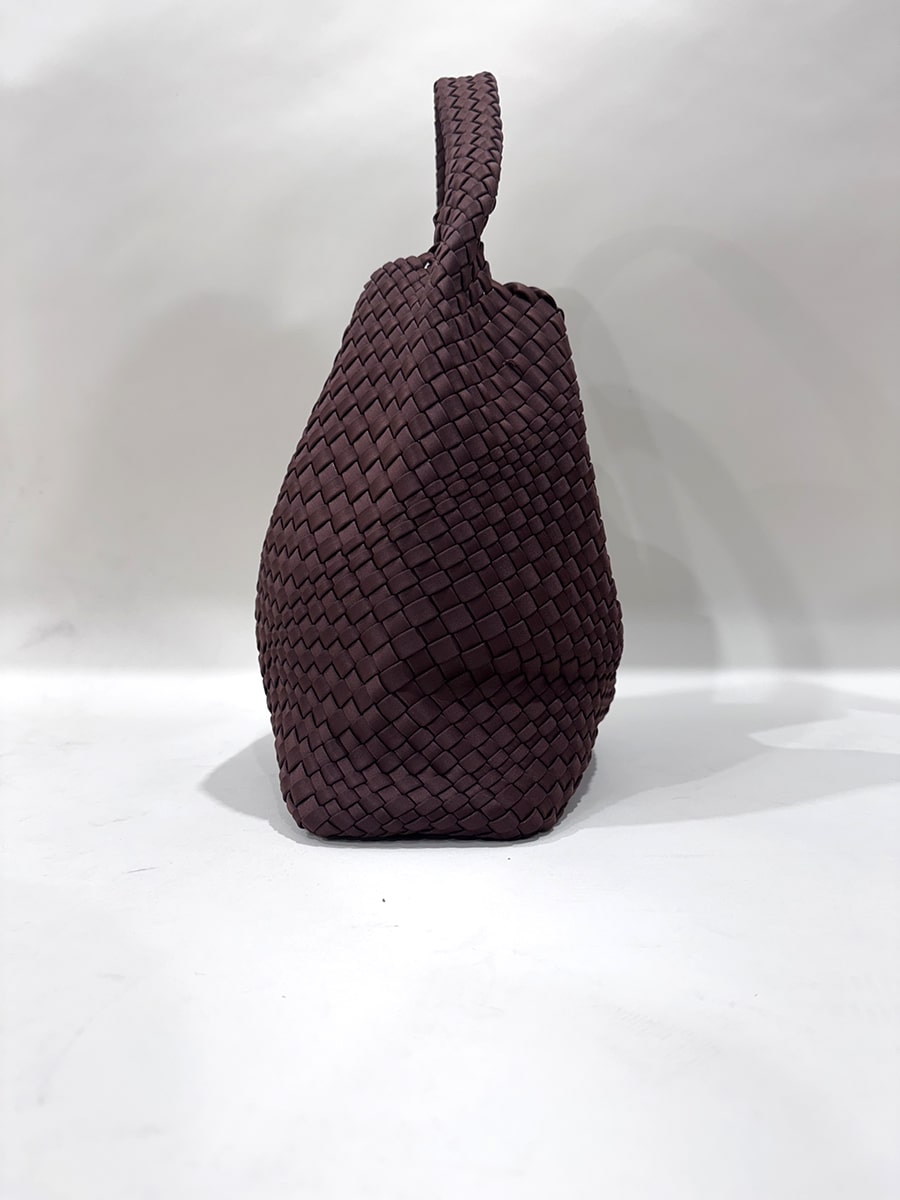 Borsa a spalla in tessuto intrecciato , clip interna per la chiusura e pochette interna portaoggetti.