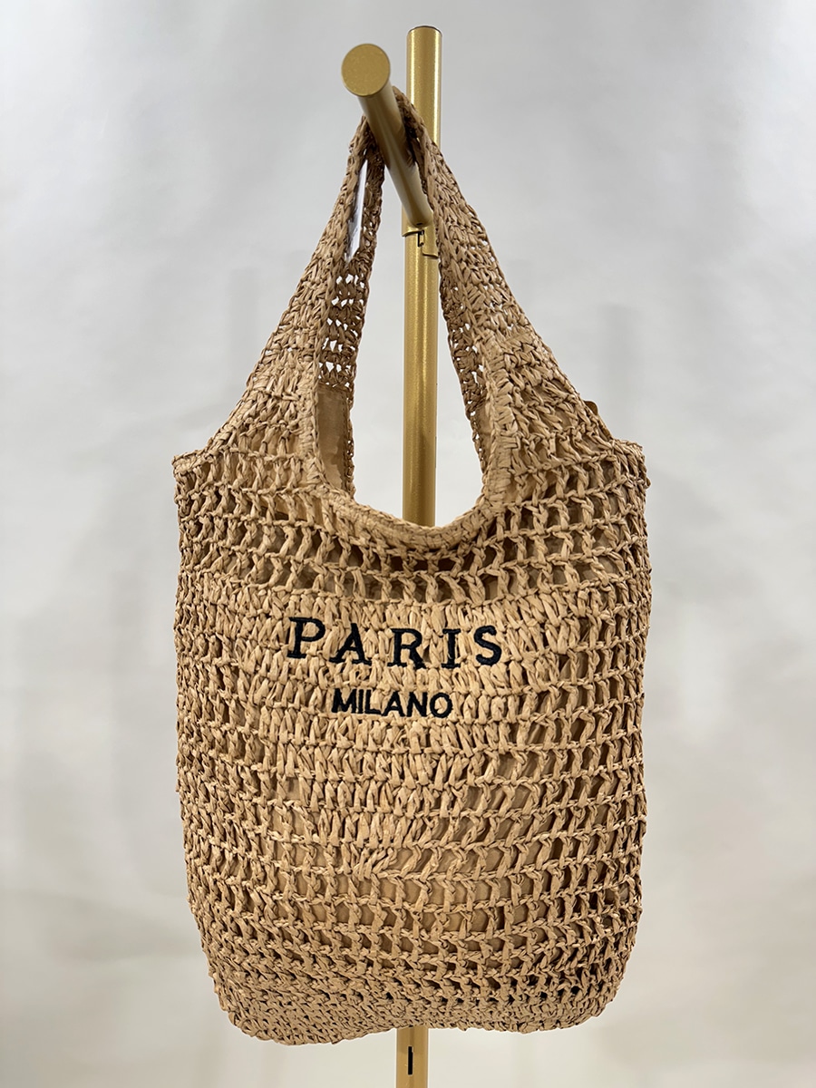 colore beige o nero , scritta ricamata in nero.Forma molto capiente con zip per la chiusura , ideale per shopping,passeggiate al mare o in città, outfit casual, minimal, boho.