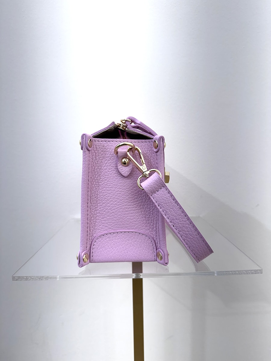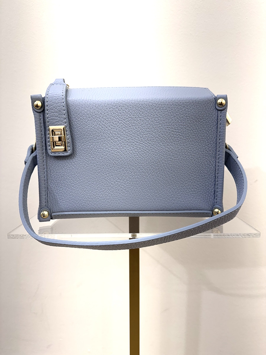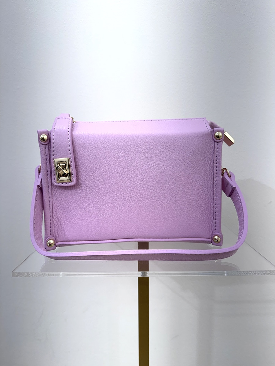 Box bag in pelle , zip per la chiusura , struttura rigida, tracolla removibile per portarla a mano e tracolla più lunga all’interno .