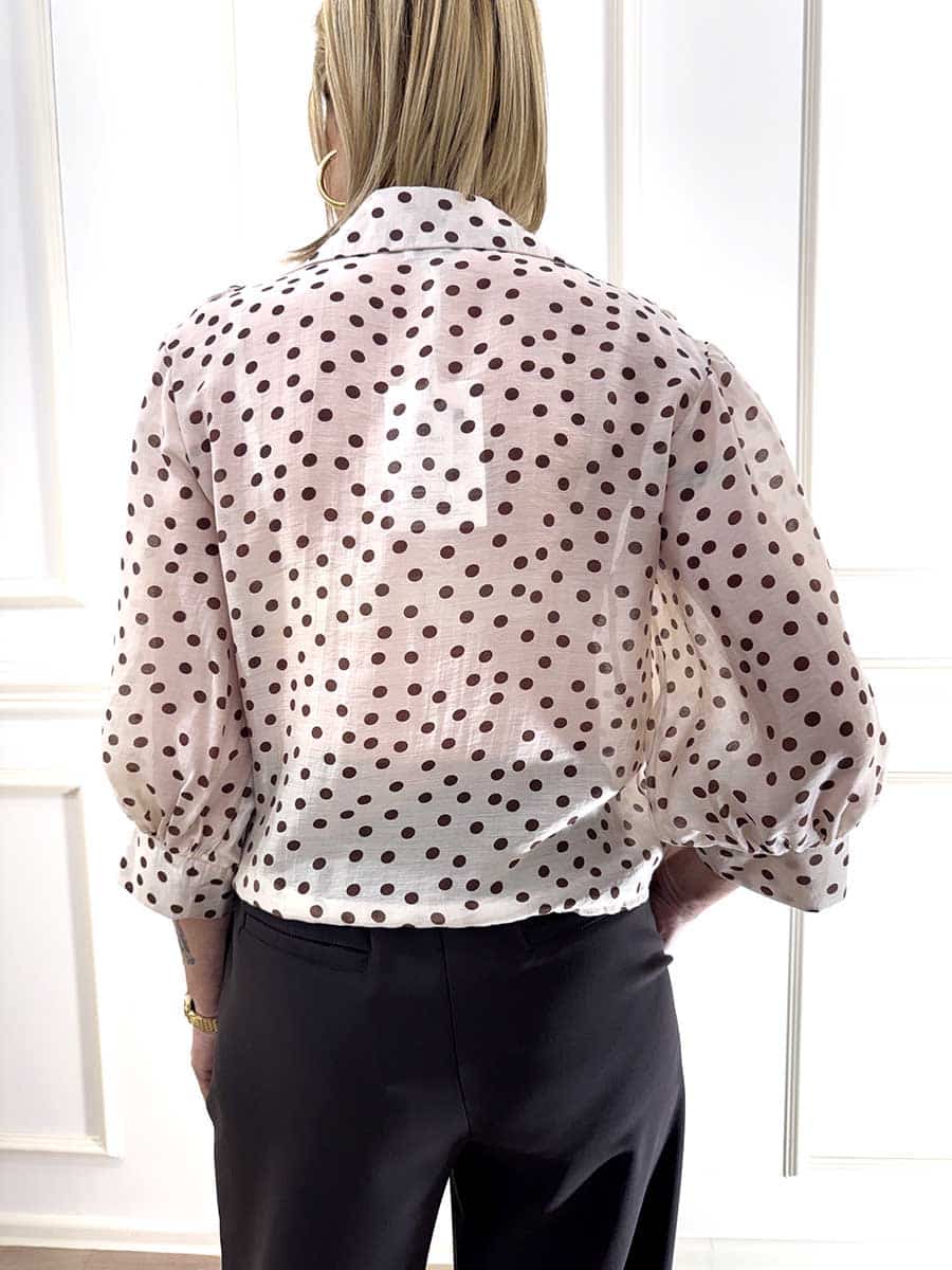 Camicia in tessuto leggero con rouges sul davanti e bottoncini, manica a palloncino. Lo scollo a v valorizza con discrezione il decolletè.