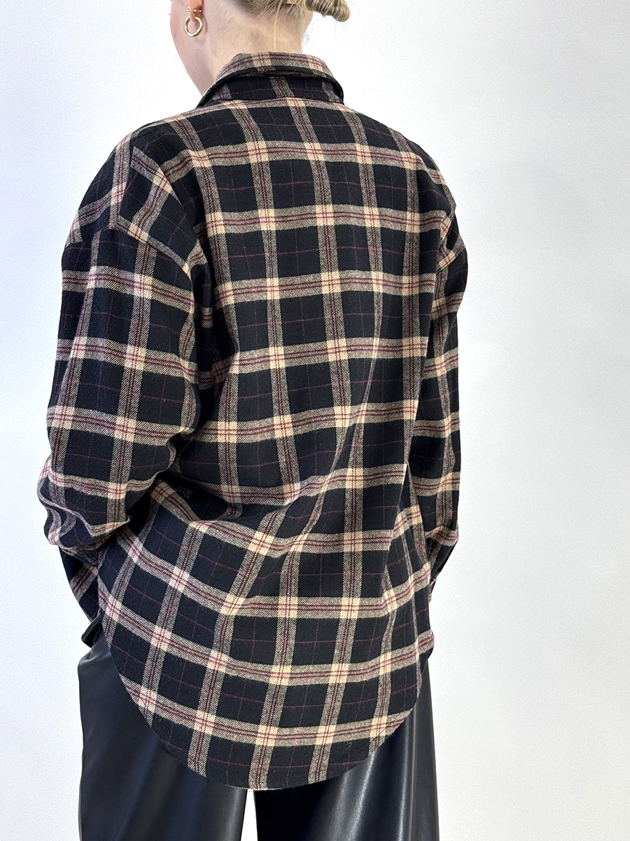 Camicia in morbida flanella a quadri nei toni del beige e del bordeaux, con linea dritta e fit leggermente oversize. Presenta colletto classico, chiusura con bottoni e taschino applicato sul petto. Perfetta come sovra camicia per un look casual e contemporaneo, ideale da abbinare a t-shirt e pantaloni in pelle per un contrasto moderno.