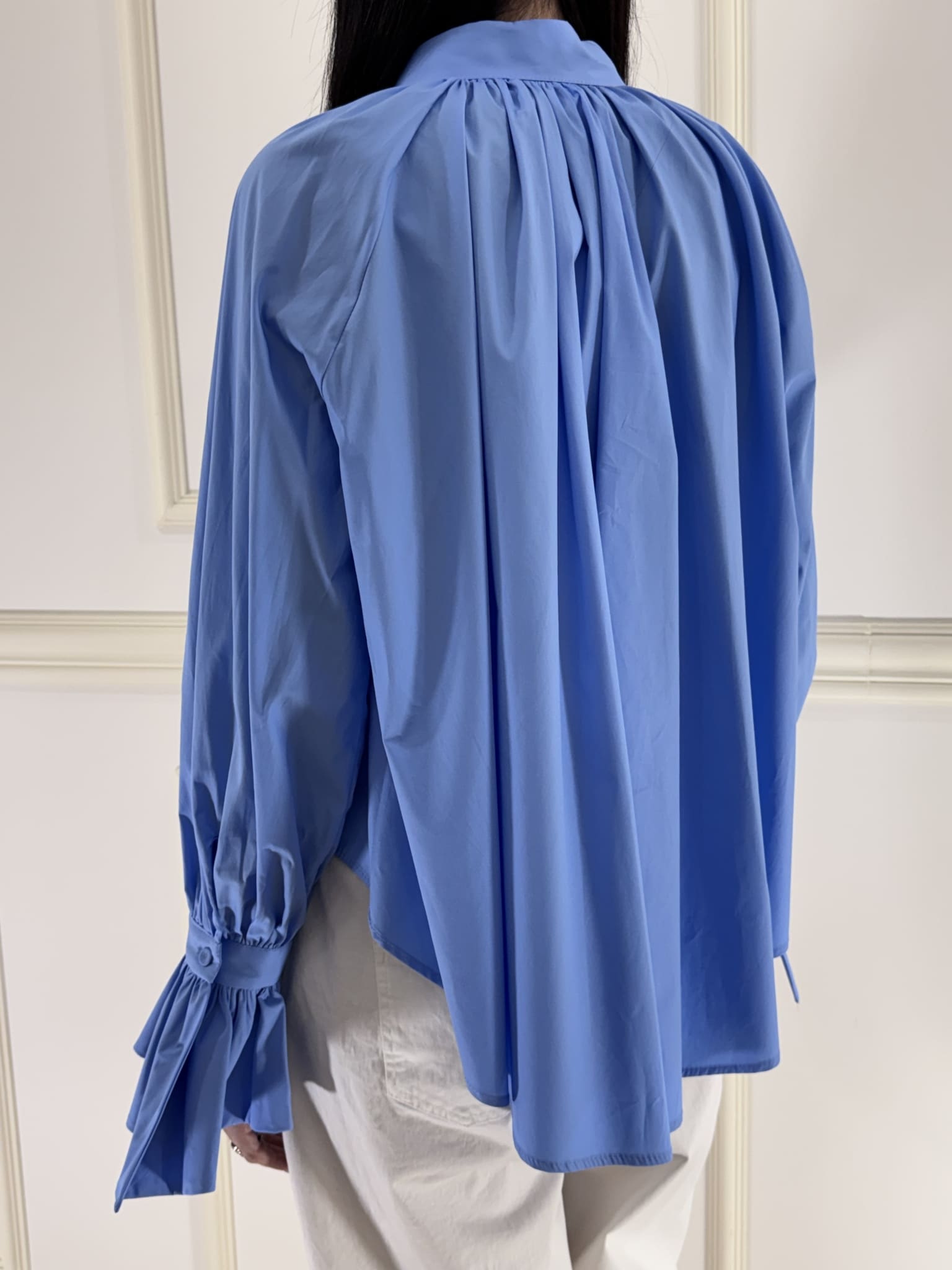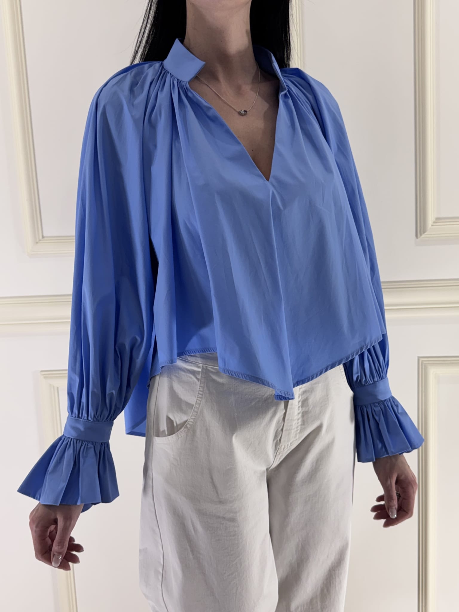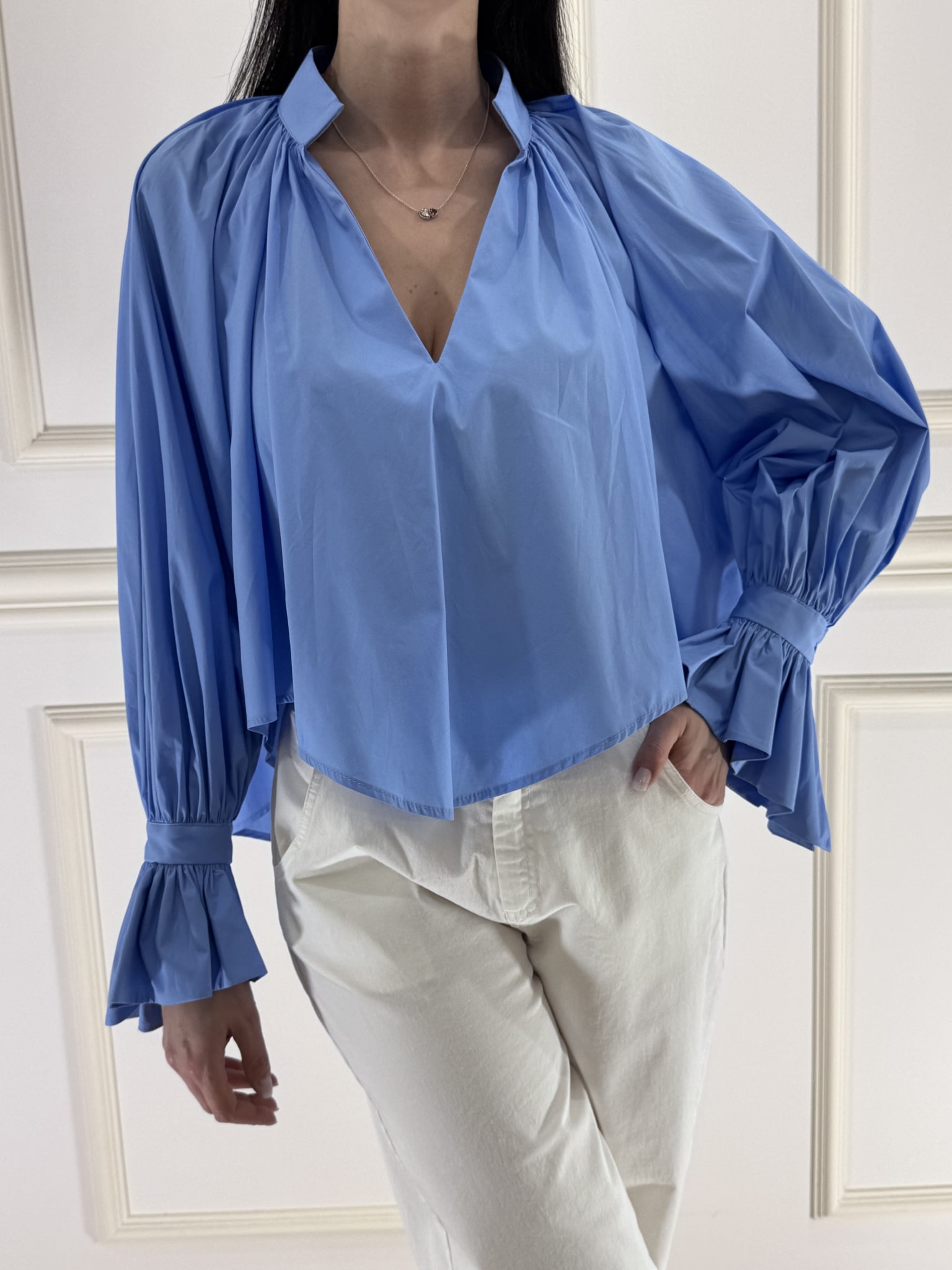 Camicia azzurra scollo a v , manica con laccetti e bottoncino, vestibilità comoda. Taglio ampio, più corta davanti e più lunga dietro.