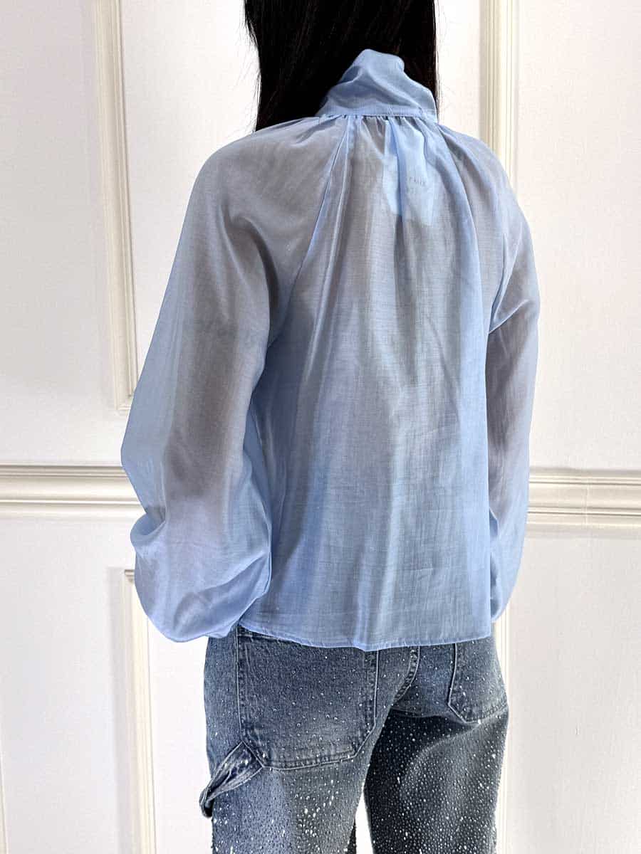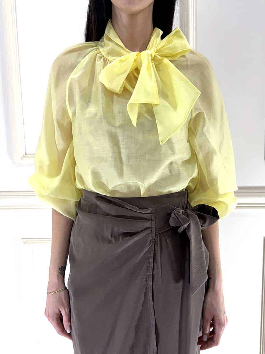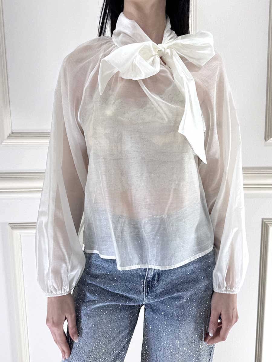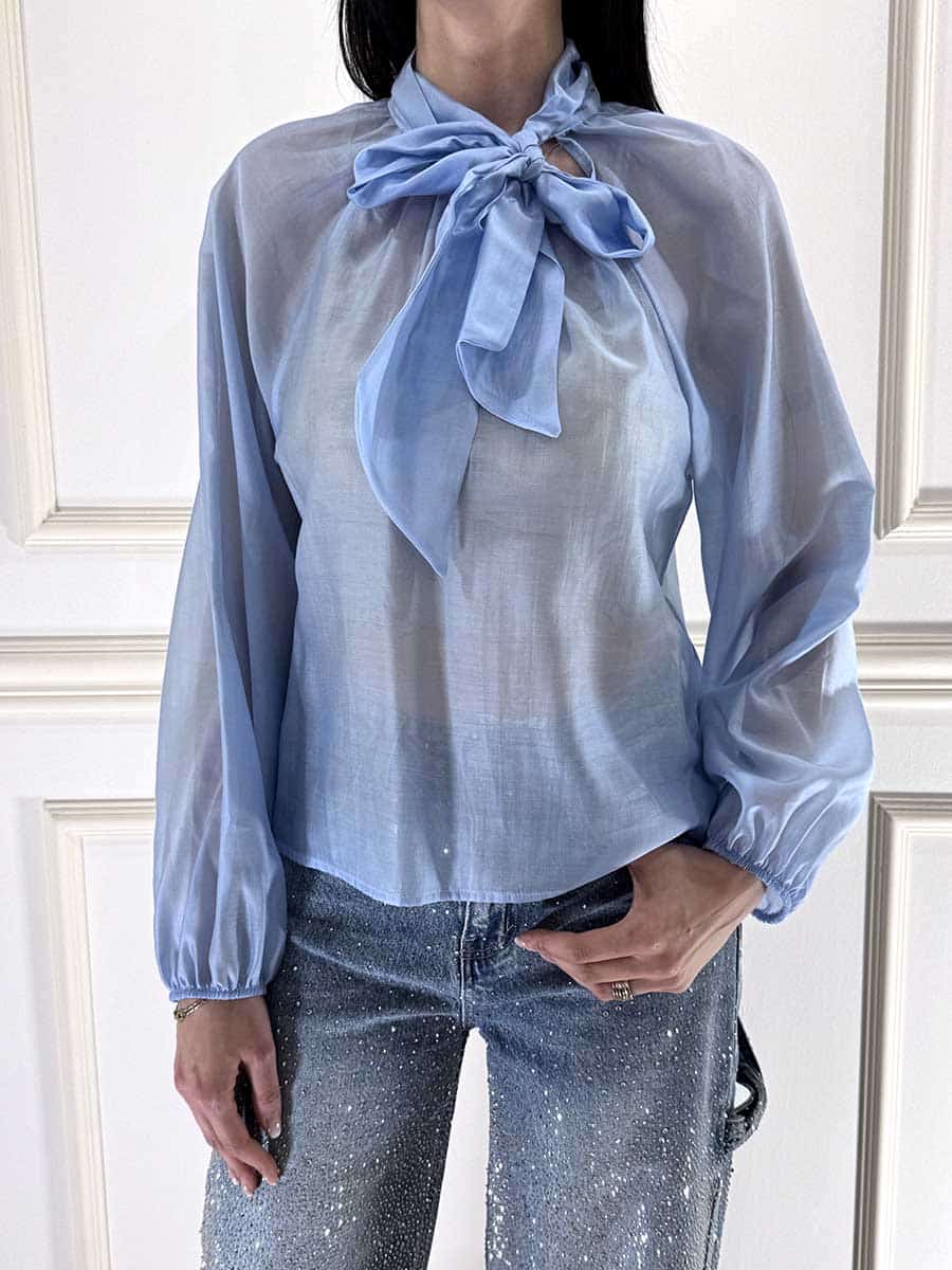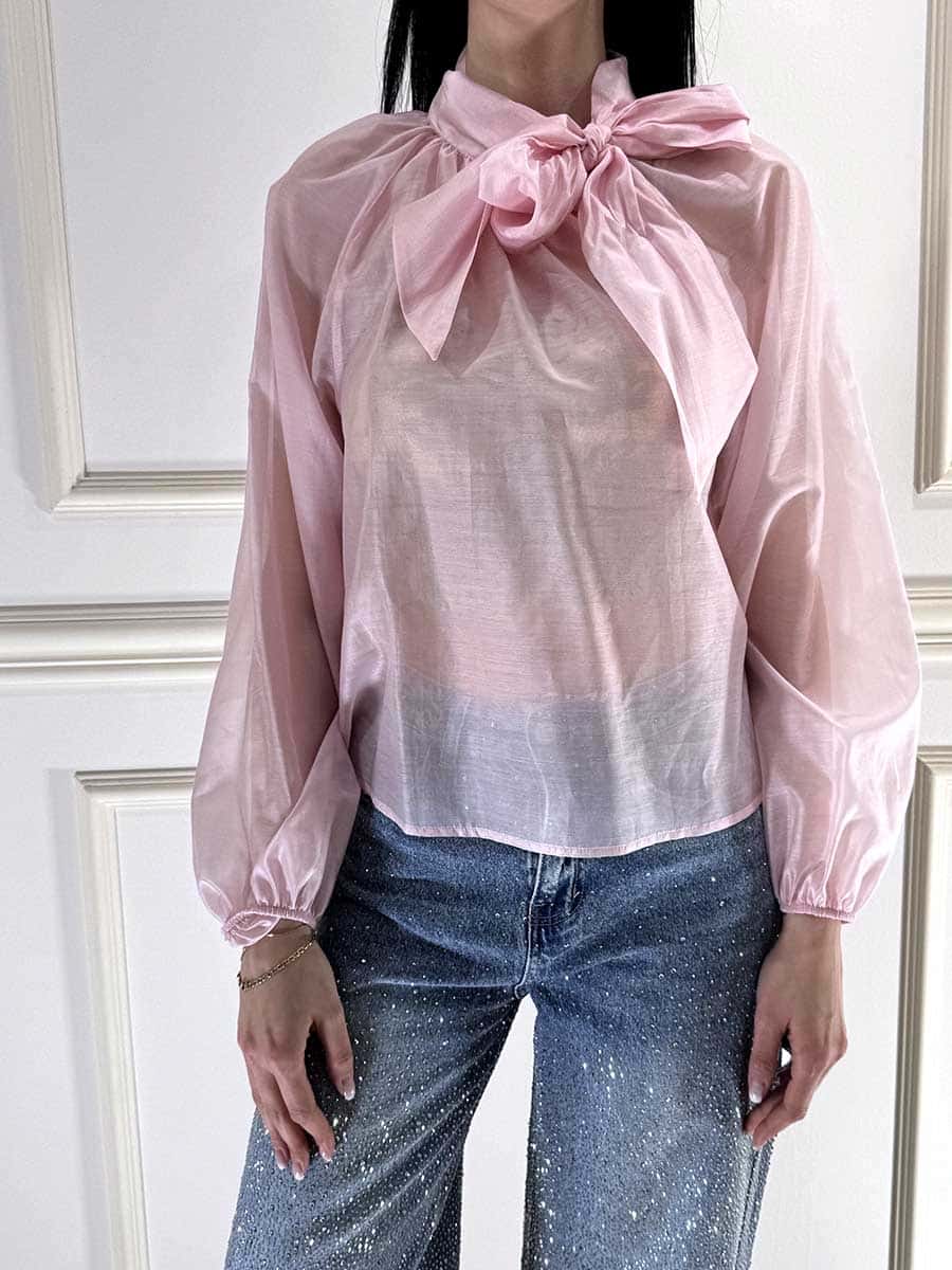 Camicia con fiocco , tessuto leggero semitrasparente, vestibilità comoda. Capo perfetto per look casual ed eleganti.