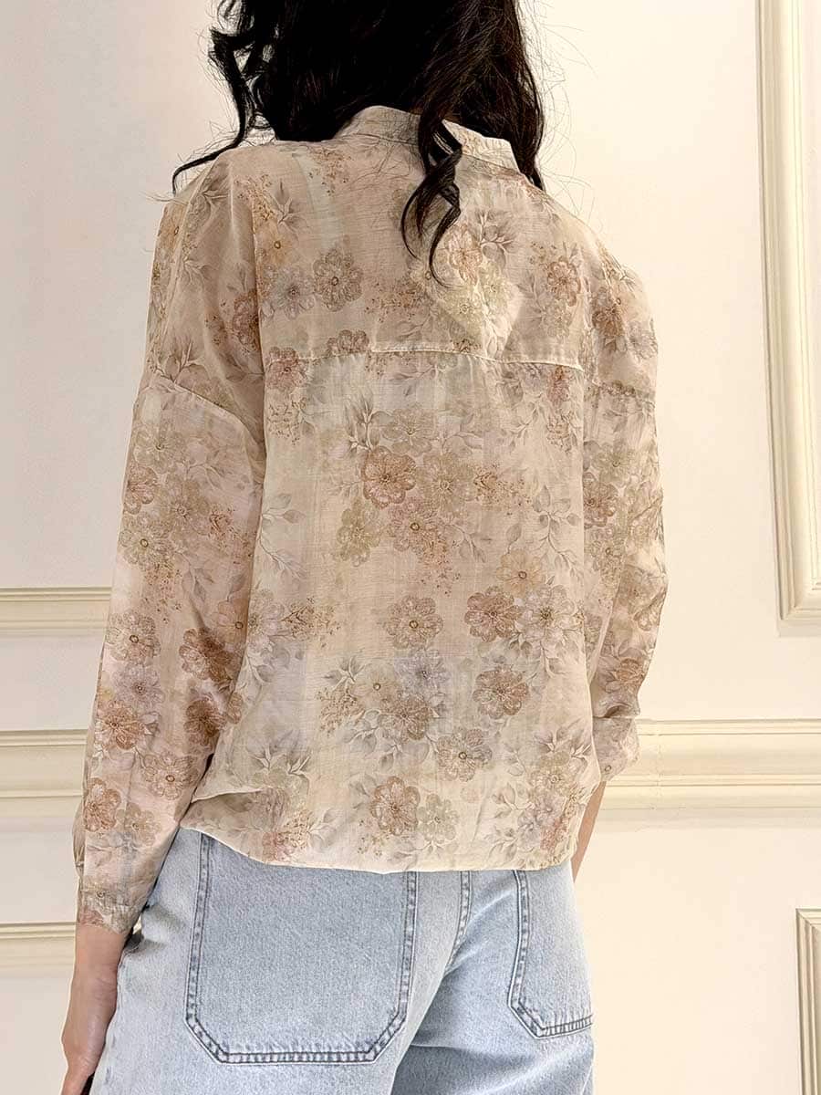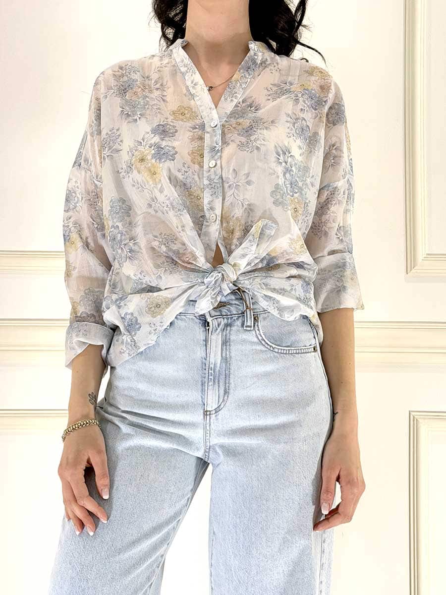 Camicia floreale tessuto leggero semitrasparente , bottoncini sul davanti, vestibilità comoda. capo femminile e versatile .