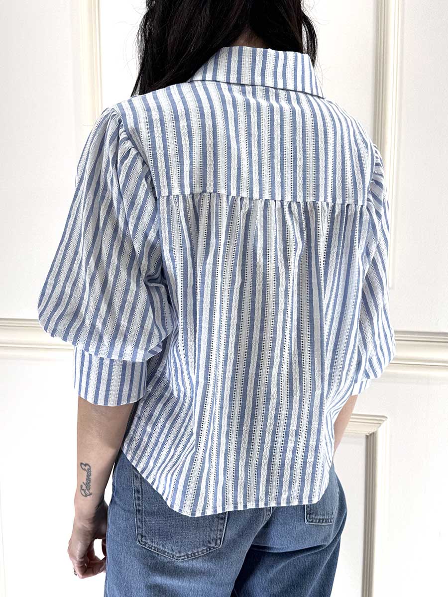 Camicia gessata , colletto e bottoncini sul davanti per la chiusura, manica a palloncino .