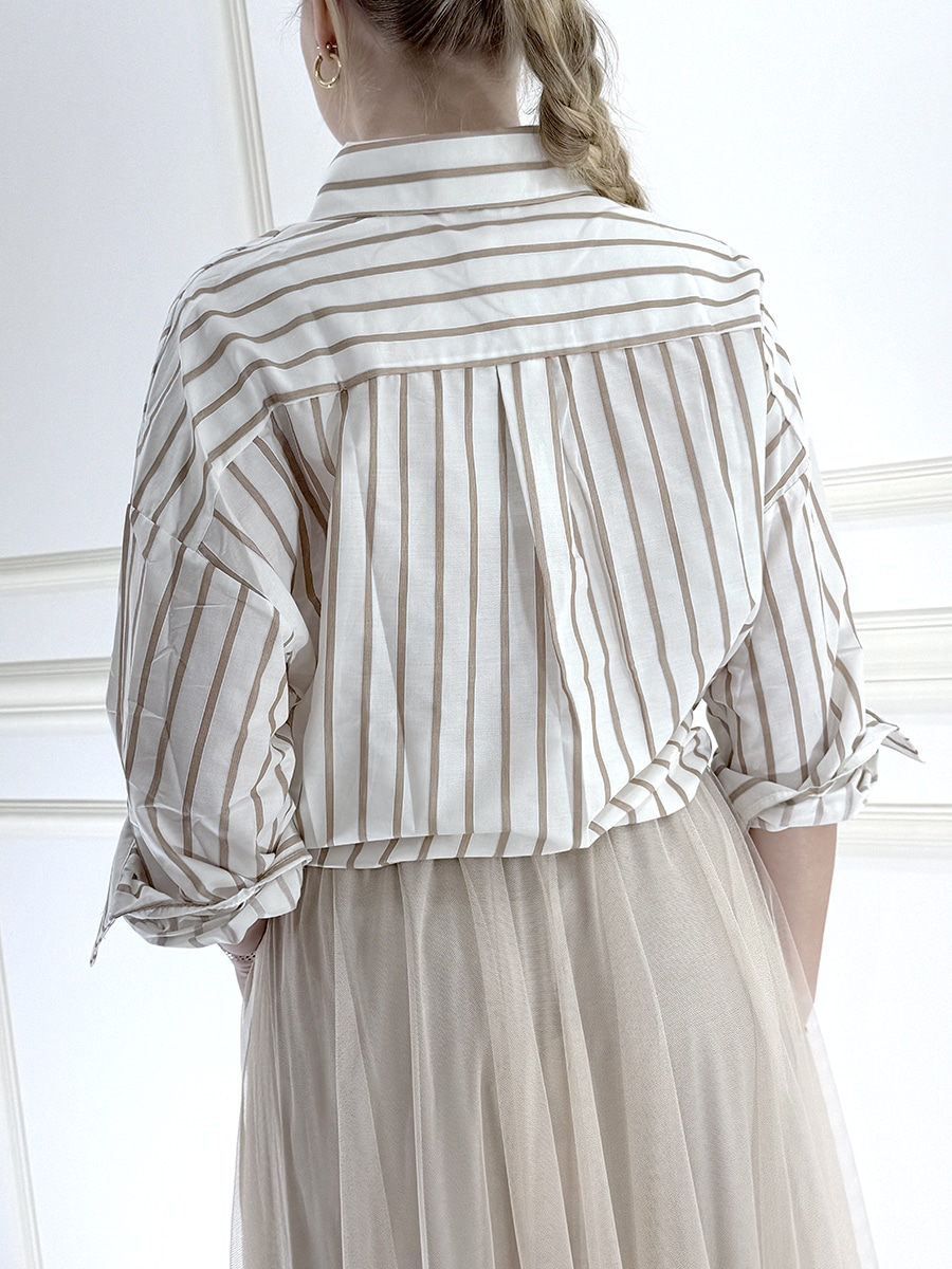 Camicia gessata , bottoncini davanti per la chiusura, vestibilità abbondante, colletto regolare.