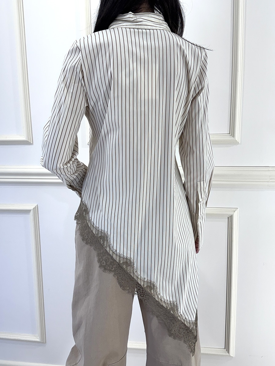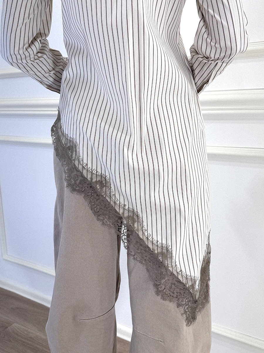 Camicia gessata fondo in pizzo asimmetrica, bottoncini davanti per la chiusura.