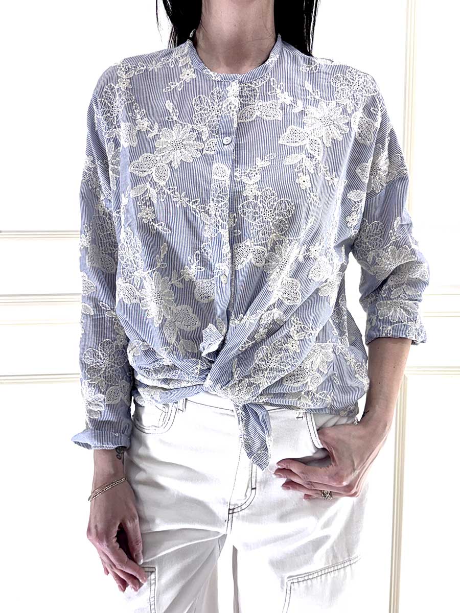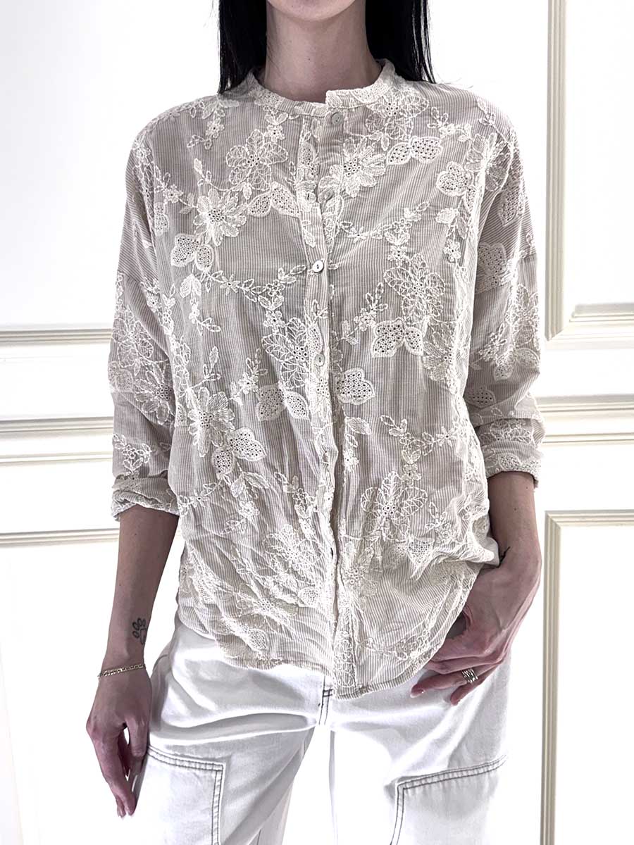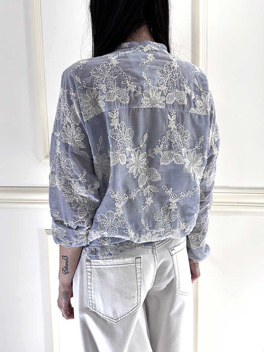 Camicia gessata , scollo a v con ricami in rilievo. Manica raglan , vestibilità comoda.