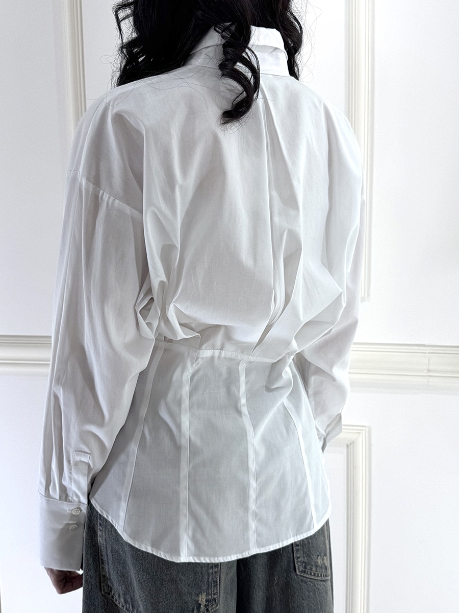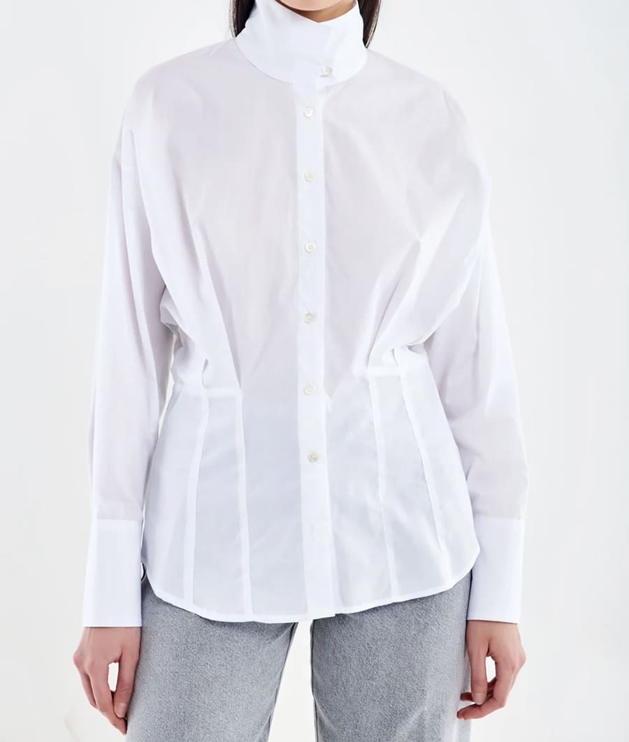Camicia modello kimono con riprese in vita, maniche lunghe e collo alto alla coreana. Chiusura frontale con bottoncini. Maniche ampie con polsino.