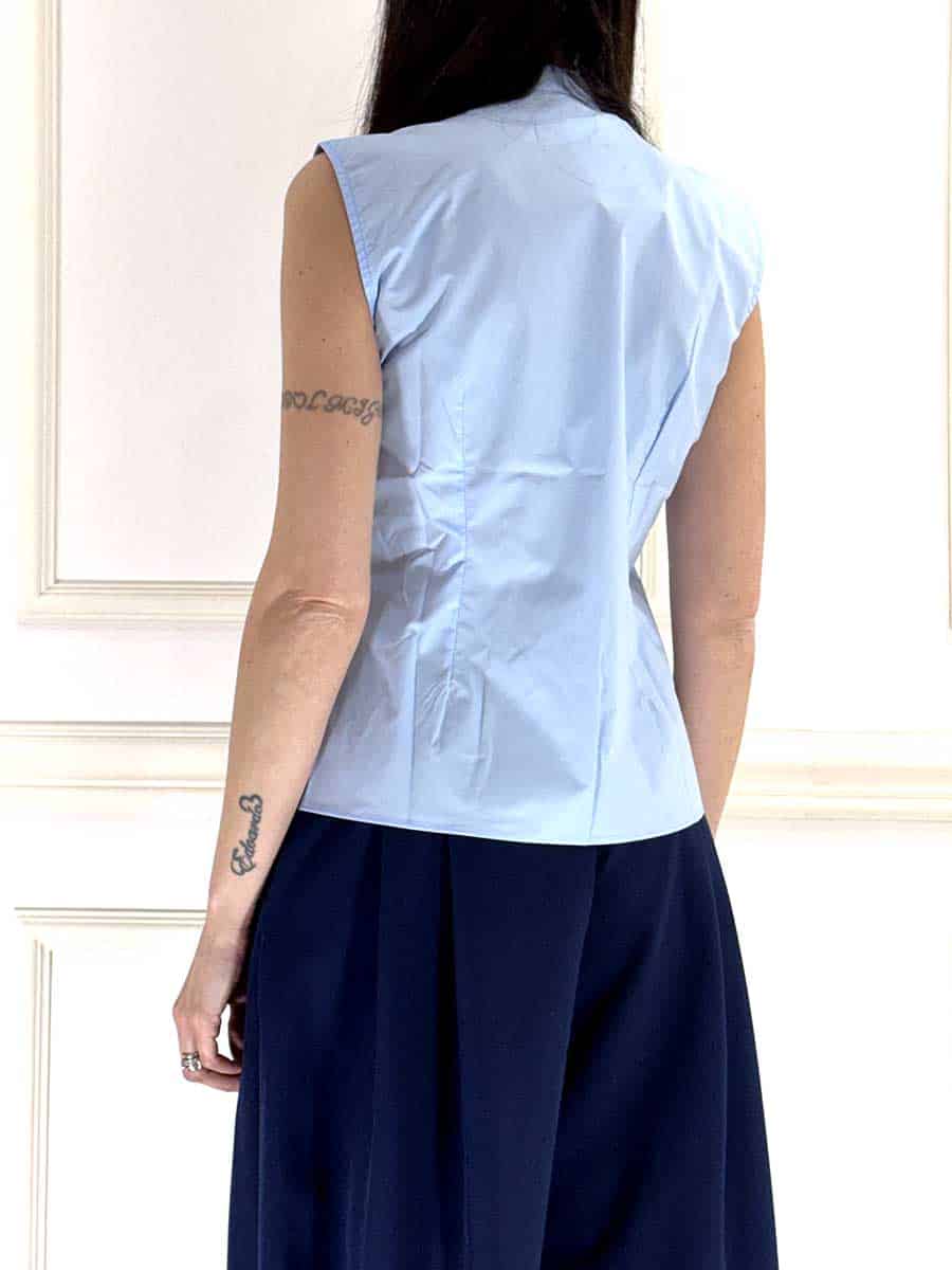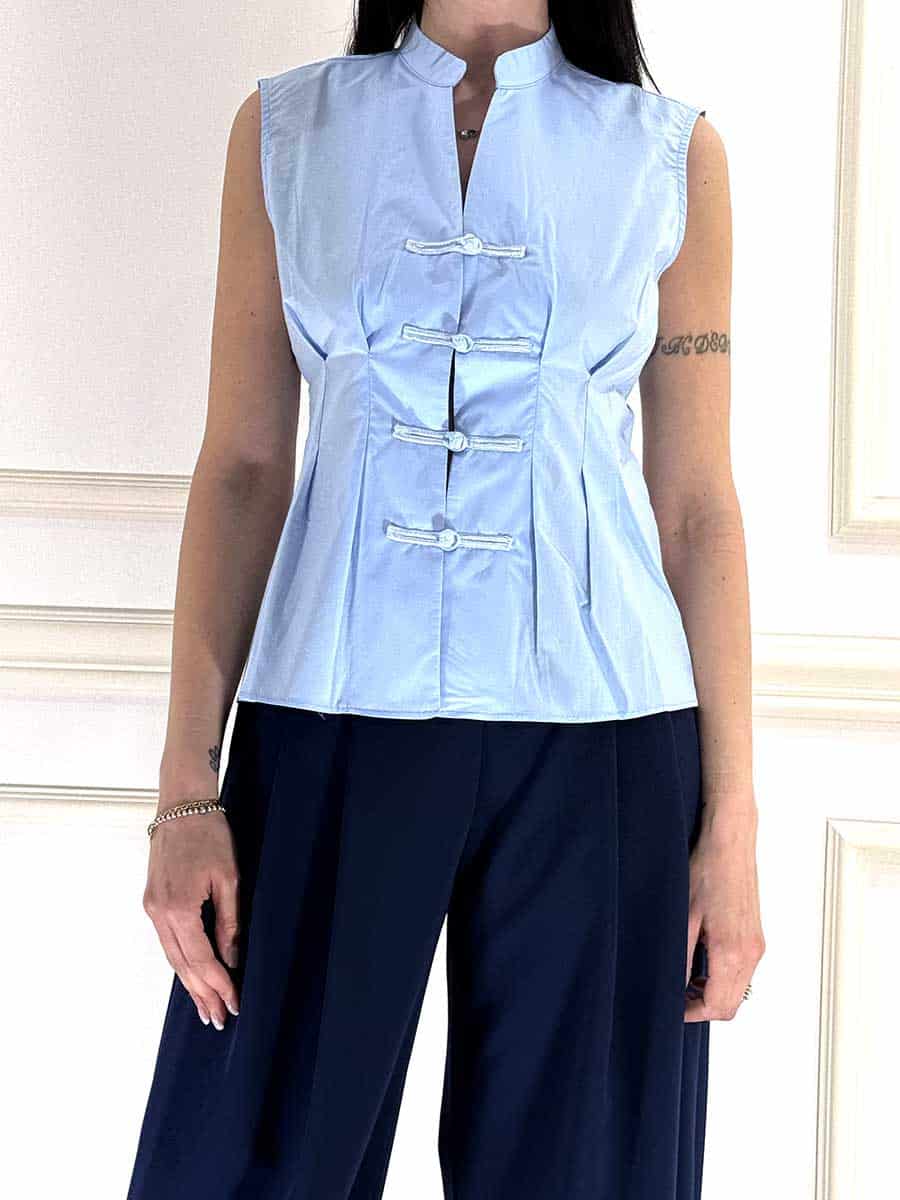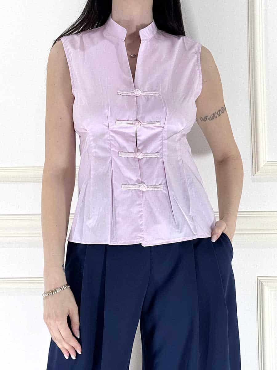 camicia smanicata con abbottonatura con alamari, in cotone , modello sfiancato.