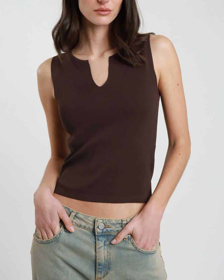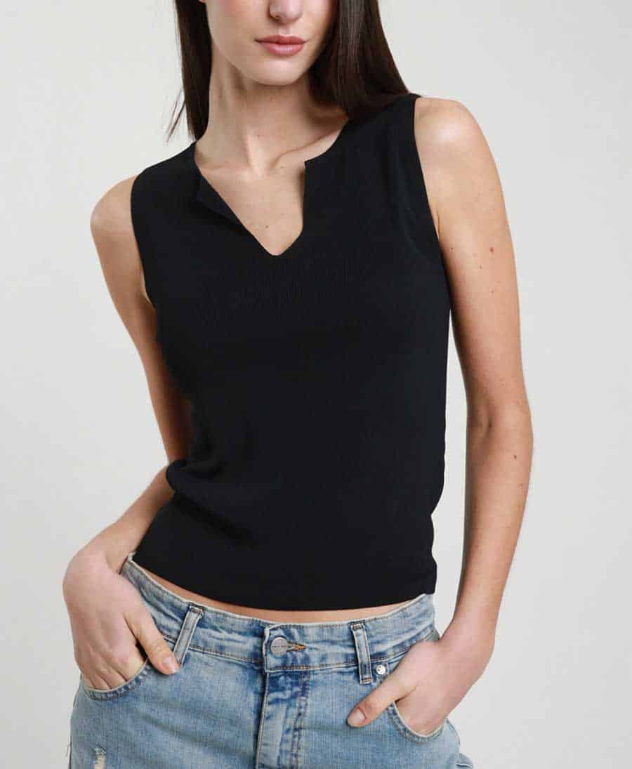 Canotta tessuto elasticizzato , scollo goccia , giromanica , il tessuto mette in risalto la silhouette.