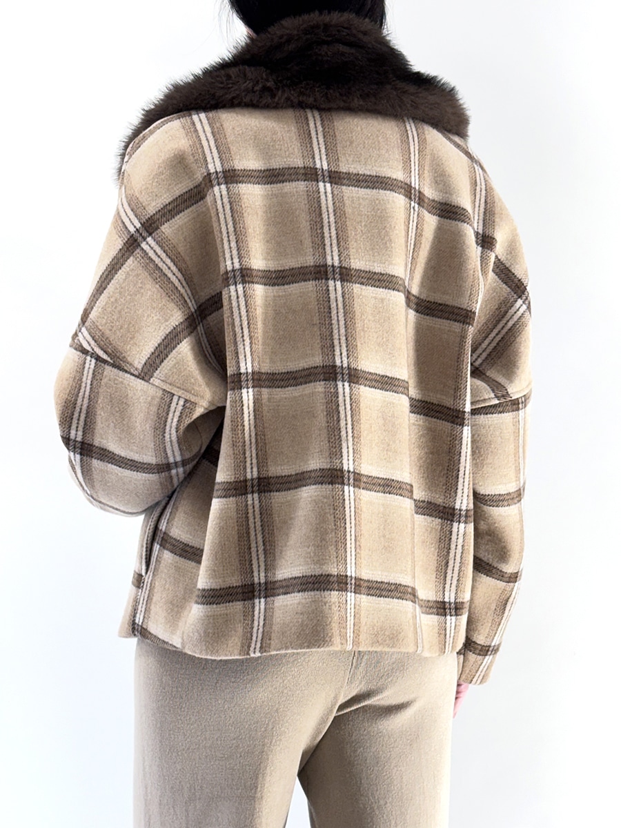Cappotto in lana foderato, corto con motivo a quadri nei toni del beige, caratterizzato da linea morbida, chiusura frontale con bottoni e colletto impreziosito da morbida pelliccia sintetica. Ideale per un look caldo e raffinato