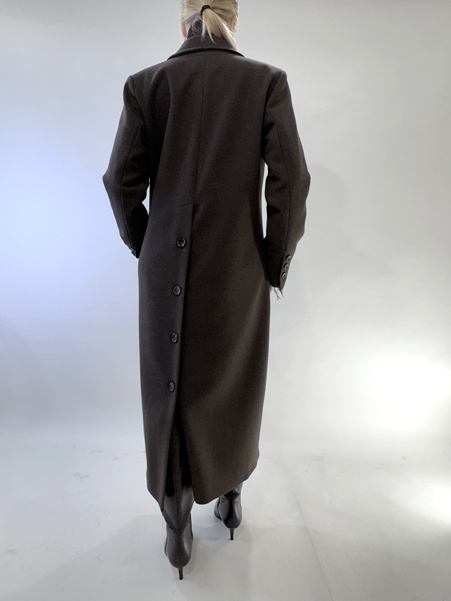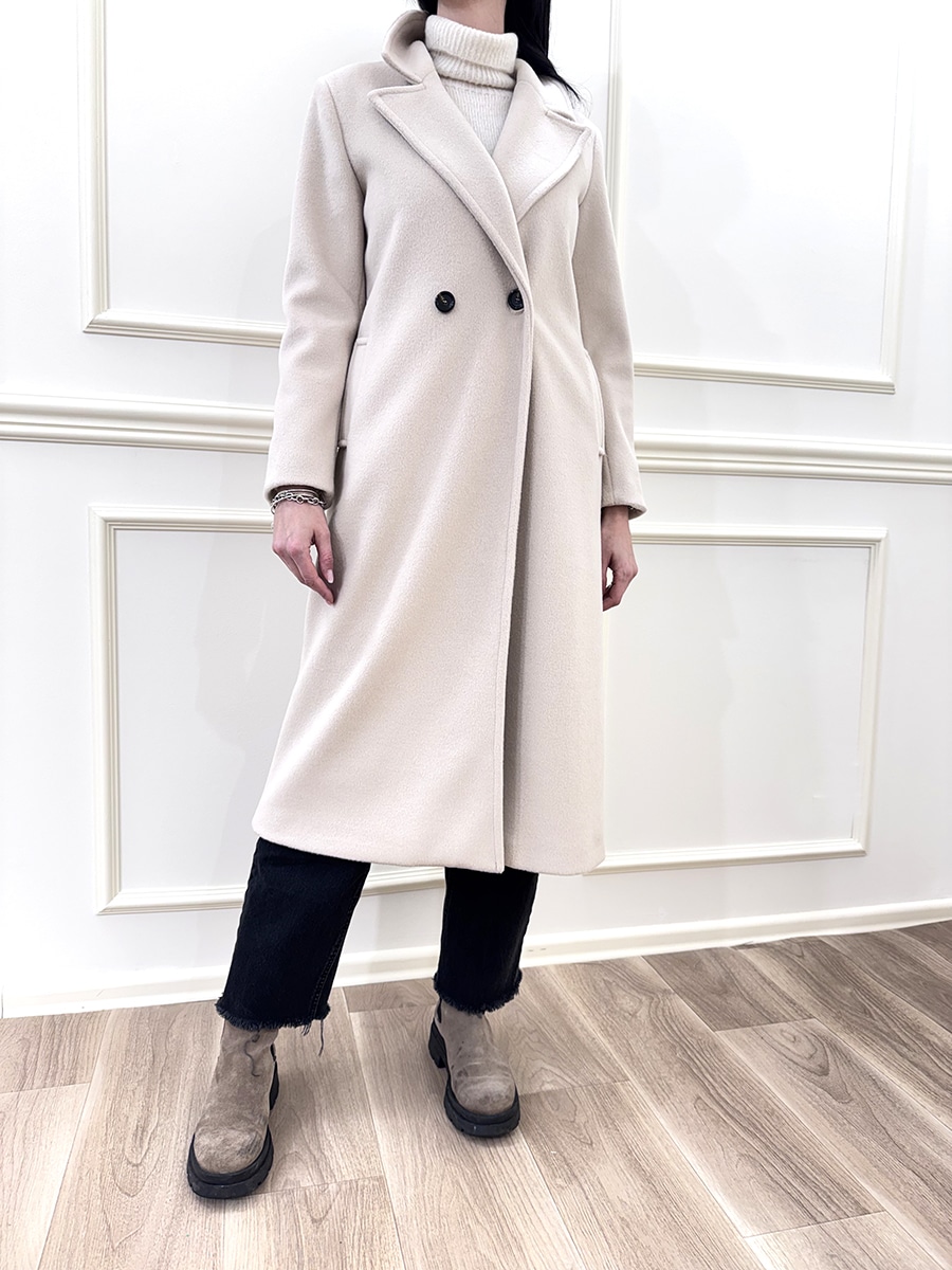 Cappotto lungo doppiopetto , bottoni sul retro , fodera interna. Linea strutturata e pulita.