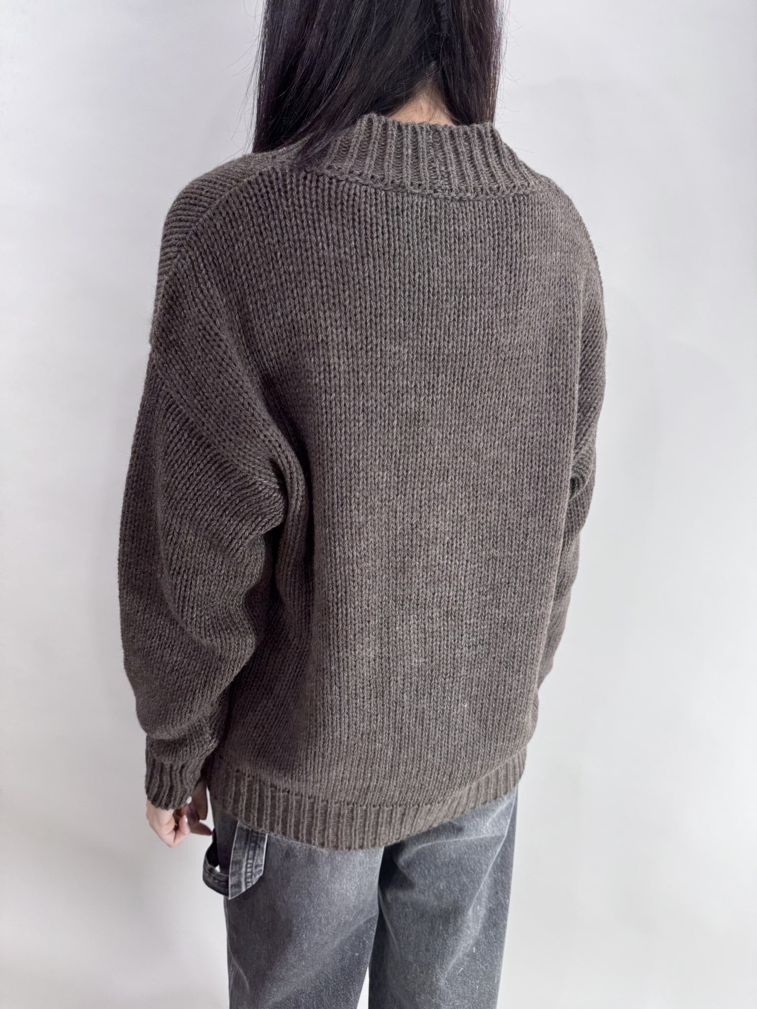 Cardigan in maglia grossa di cotone, con scollo a V e chiusura frontale a quattro bottoni. Tasche applicate sul davanti e bordo a costine su polsini e fondo. Vestibilità morbida e casual. Disponibile nelle varianti moro e burro.