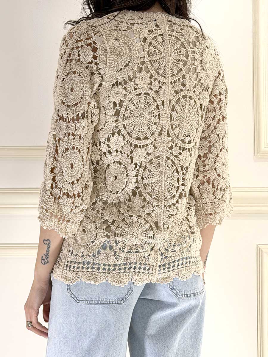 Cardigan crochet colore latte manica a 3/4 senza bottoni ne laccetti per la chiusura, vestibilità comoda.