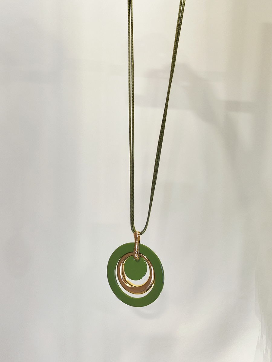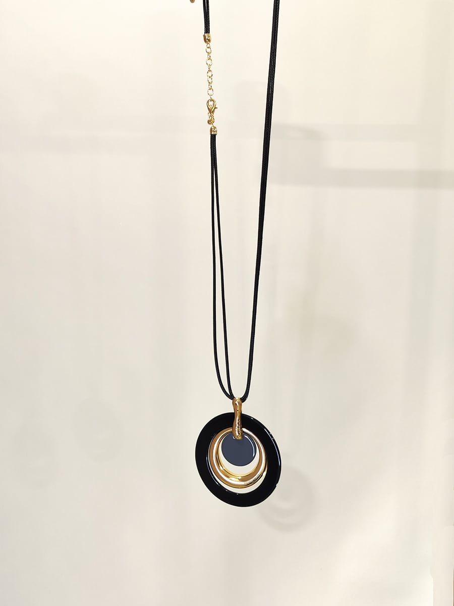 Collana lunga con cordoncino e ciondolo rotondo a cerchi concentrici nei toni blu, oro e bianco. Stile moderno, ideale per look casual-chic. Disponibili nei colori rosso, verde, camel, blu e nero.
