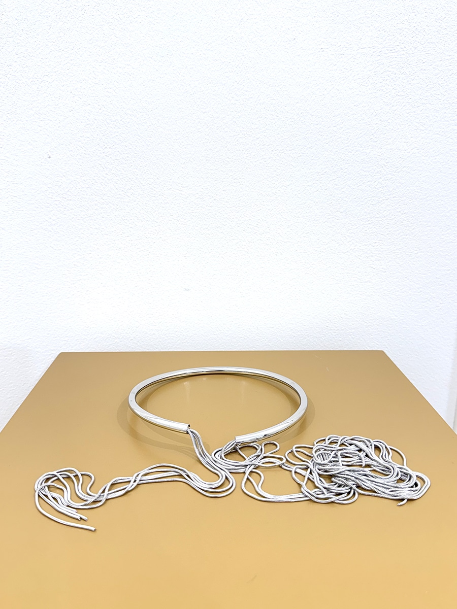 Collana rigida dal design elegante e moderno, arricchita da sottili fili metallici intrecciati che scendono delicatamente creando movimento e luminosità. Un accessorio raffinato e originale, perfetto per valorizzare outfit sia casual che eleganti. Disponibile nelle varianti colore oro e argento.