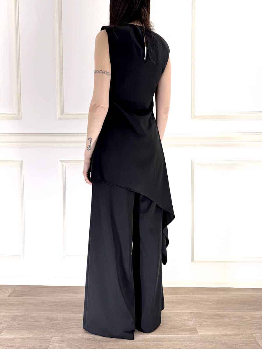 Completo in tessuto fluido composto da blusa asimmetrica girocollo , giromanica, bottoncini sul retro per la chiusura. Pantalone con elastico in vita gamba larga.
