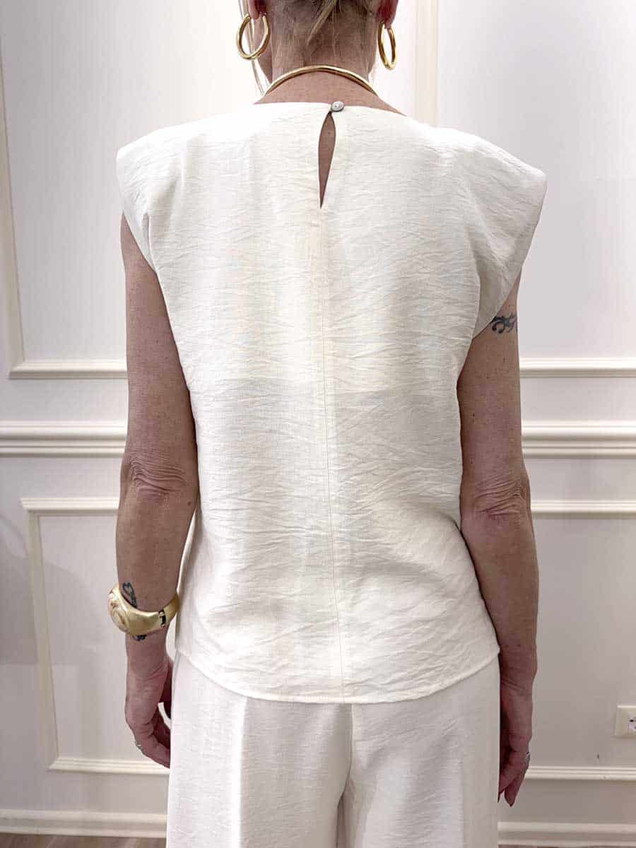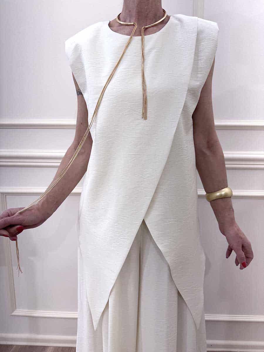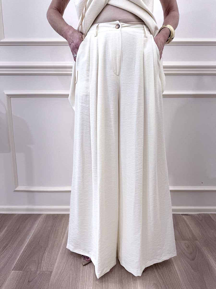 Completo composto da gilet con abbottonatura sul retro per la chiusura, pantalone con pences sul davanti zip e bottone, tasche laterali, modello gamba larga.