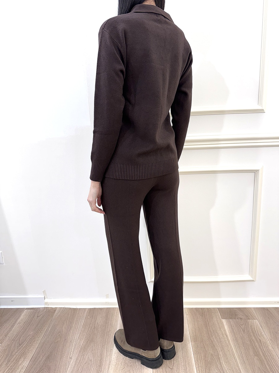 Completo in maglia composto da maglia scollo v con colletto, pantalone con elastico in vita e coulisse , tasche per il massimo comfort.