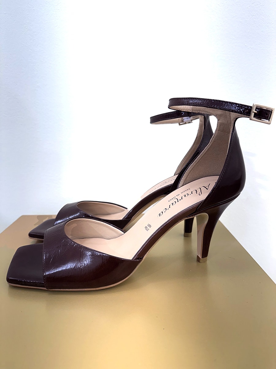 Decolletè punta quadra , cinturino regolabile alla caviglia in vernice.