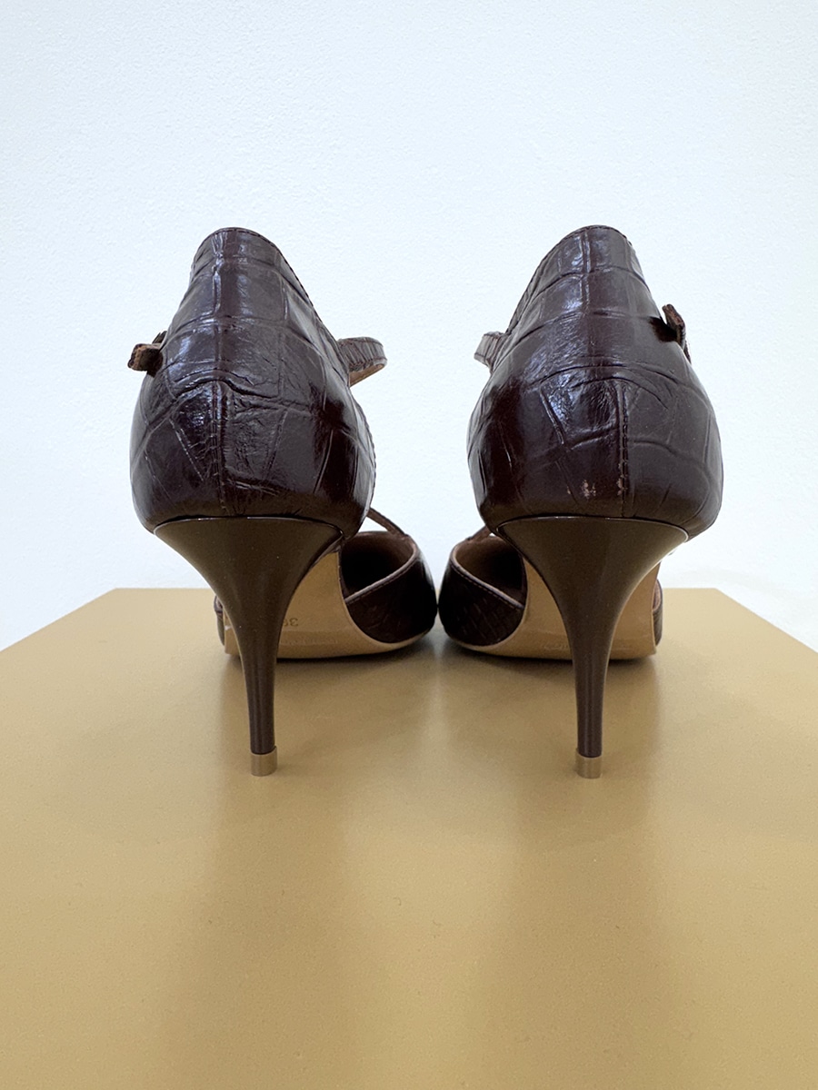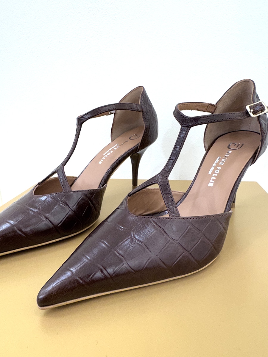 Elegante decolletè in stampa cocco a punta, cinturino regolabile alla caviglia.
