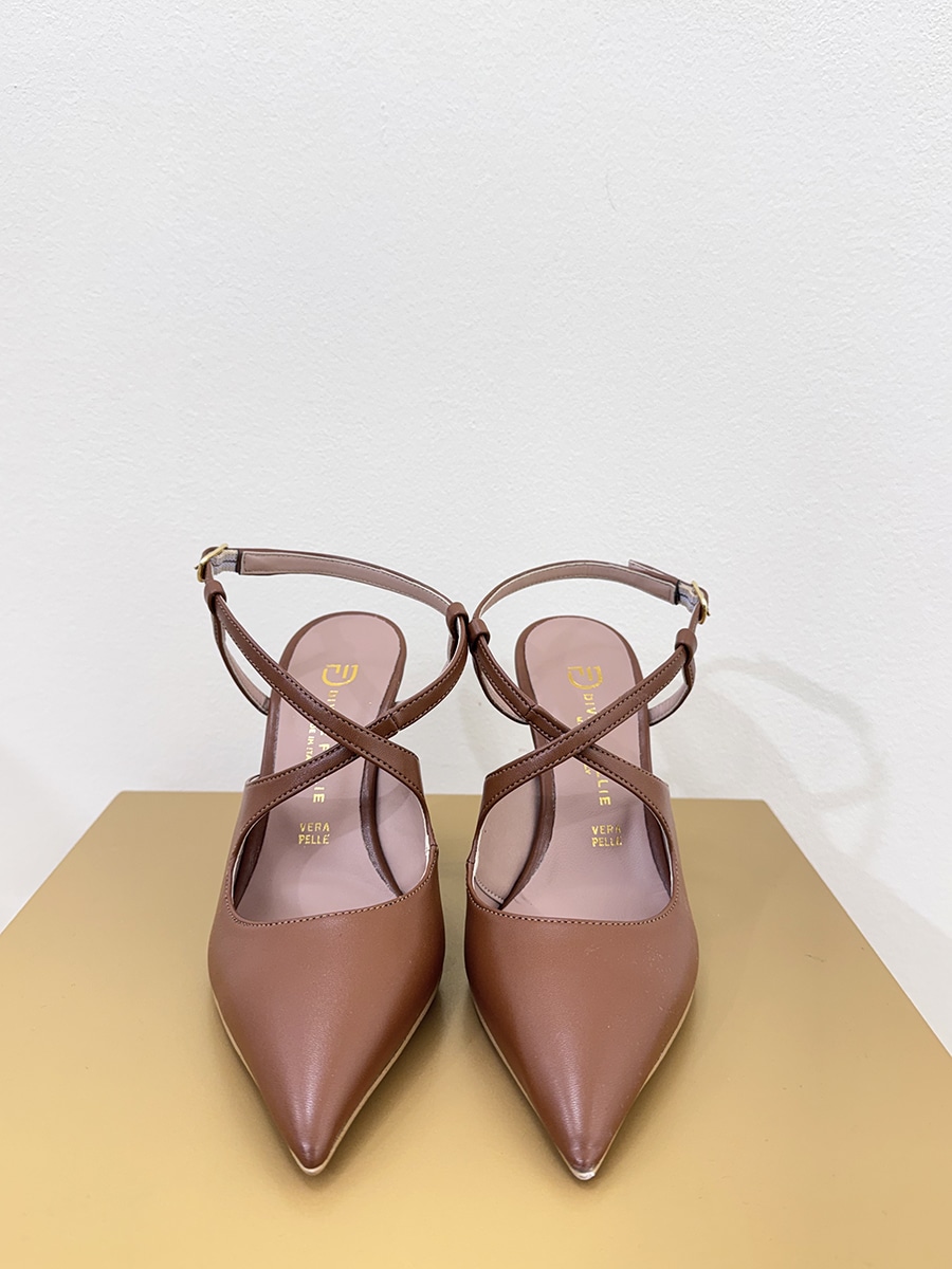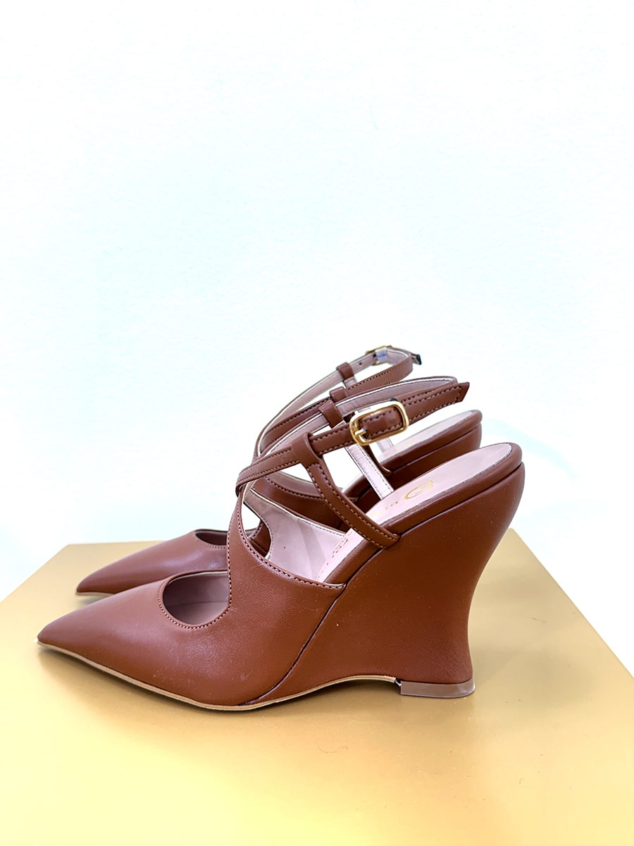 Decolletè con zeppa dal design elegante e femminile, realizzate in pelle liscia. Modello a punta affusolata con apertura sul collo del piede e cinturini incrociati con fibbia regolabil alla caviglia. Zeppa slanciata ma stabile, ideale per unire comfort e stile. Perfette per completare look raffinati sia da giorno che da sera.